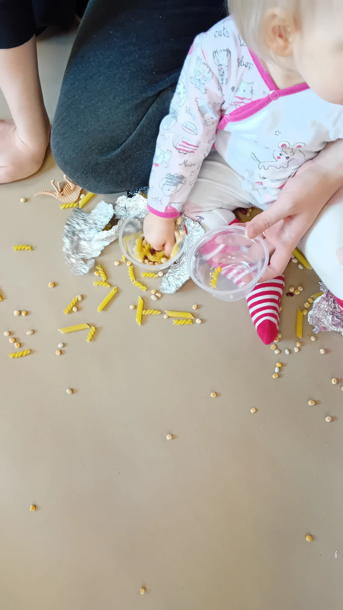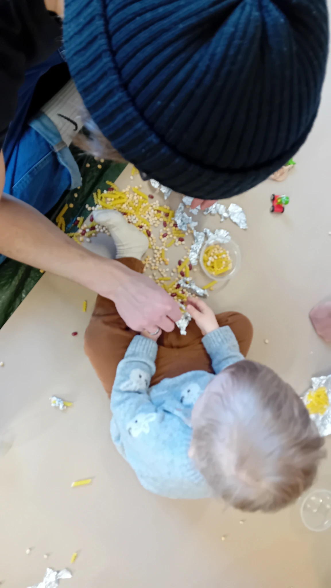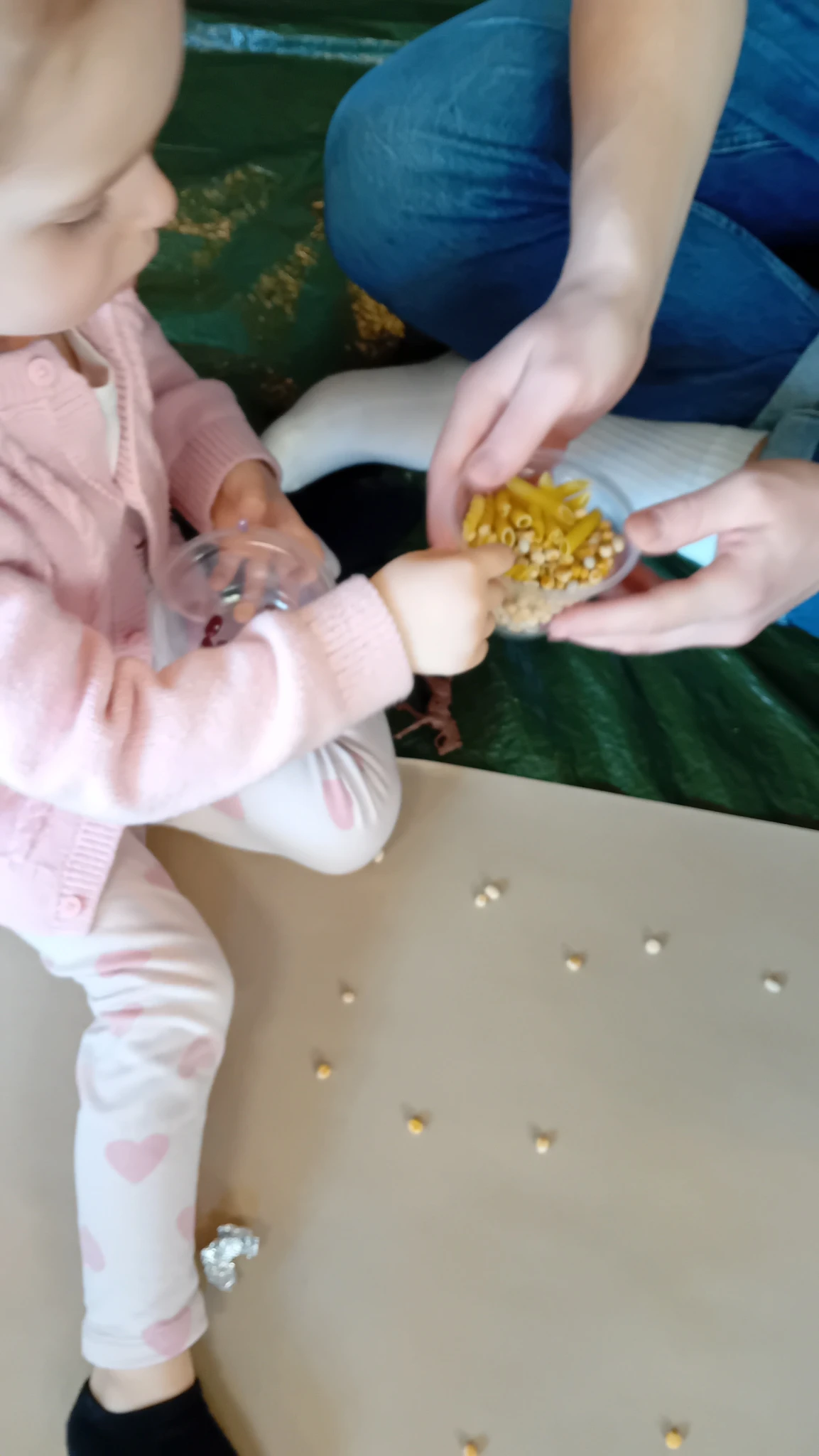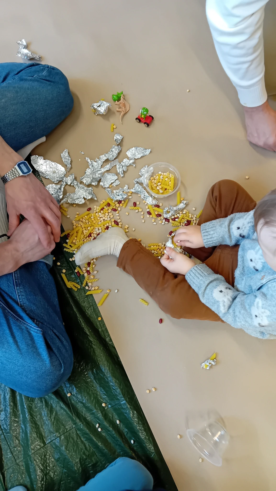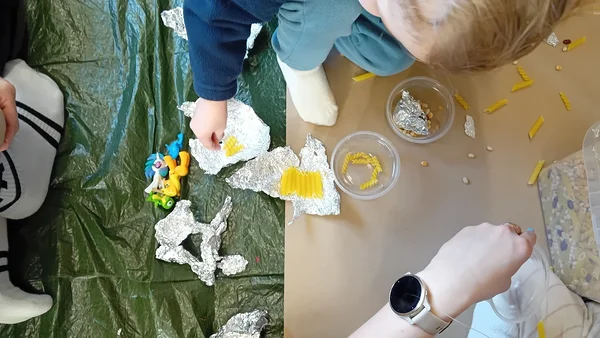 Meie alustasime harutamisest. Harutasime fooliumi seest lahti suure hulga erinevaid figuure, vaatasime ja sättisime neid pikkuse ja värvide järgi hulkadesse. Seejärel sorteerisime ubade ja herneste hulgast välja makarone ja pakkisime neid fooliumisse, see oli päris keeruline töö.