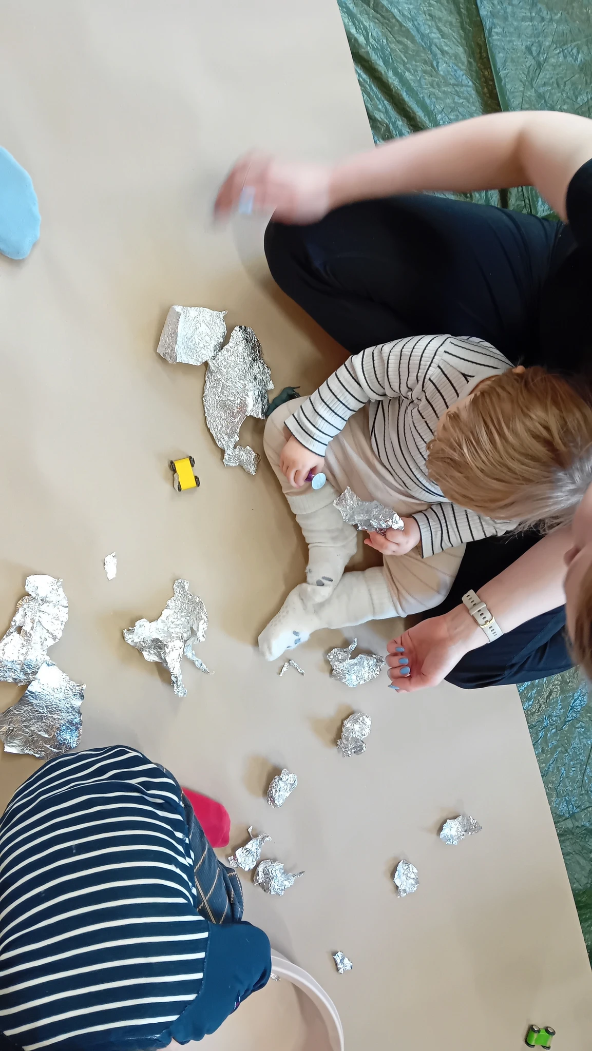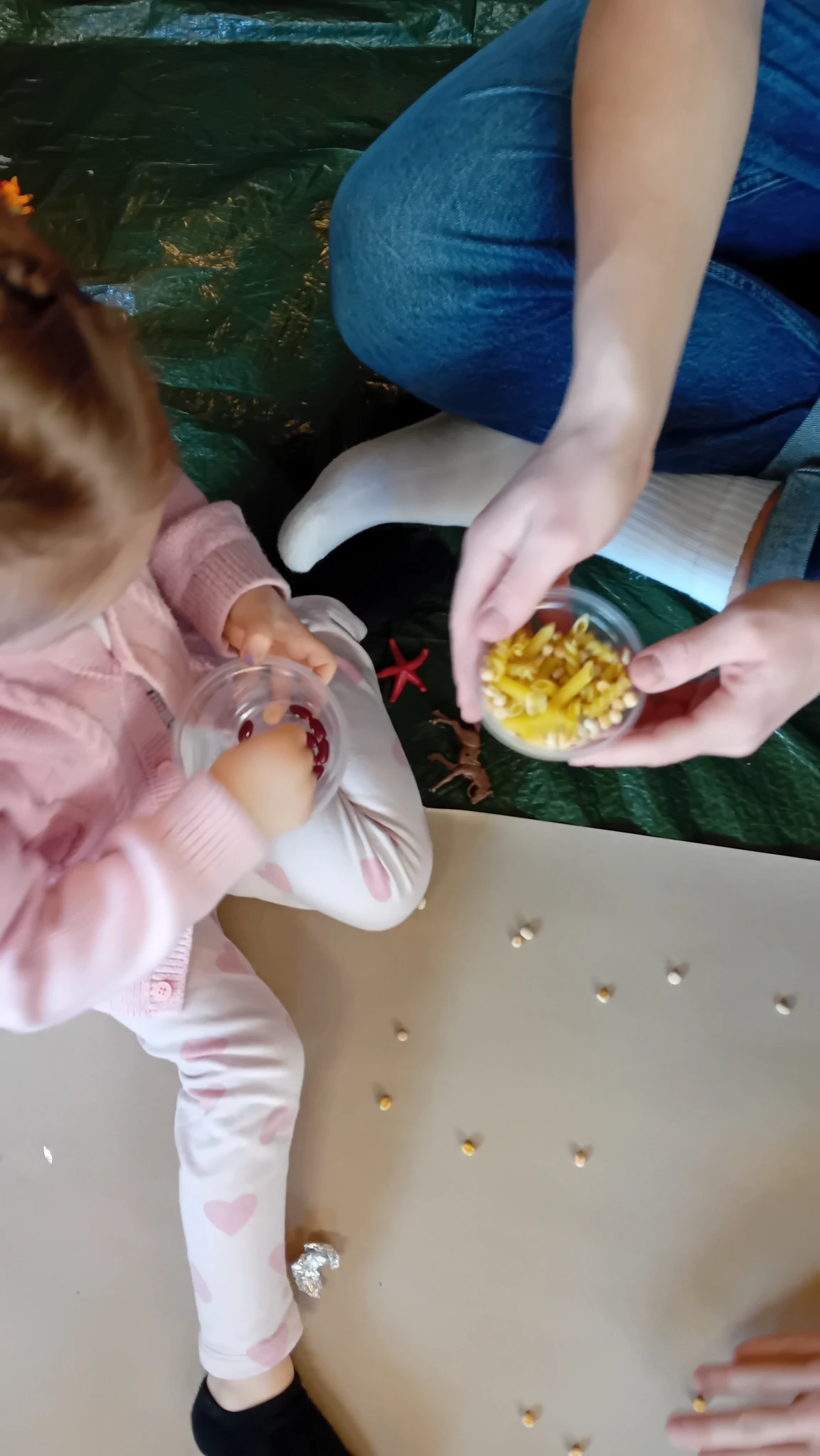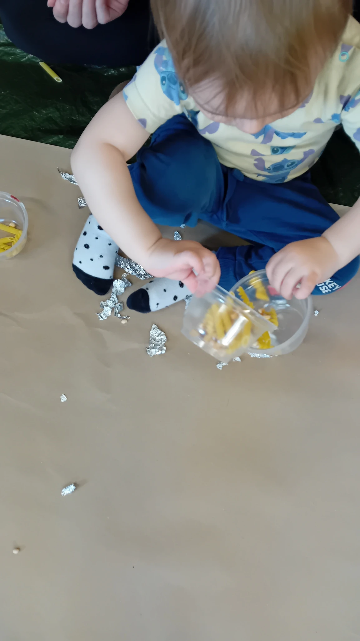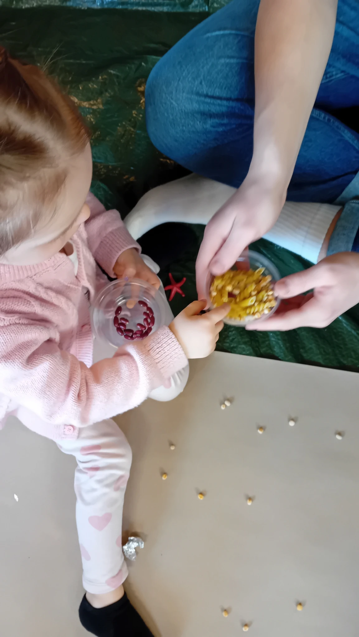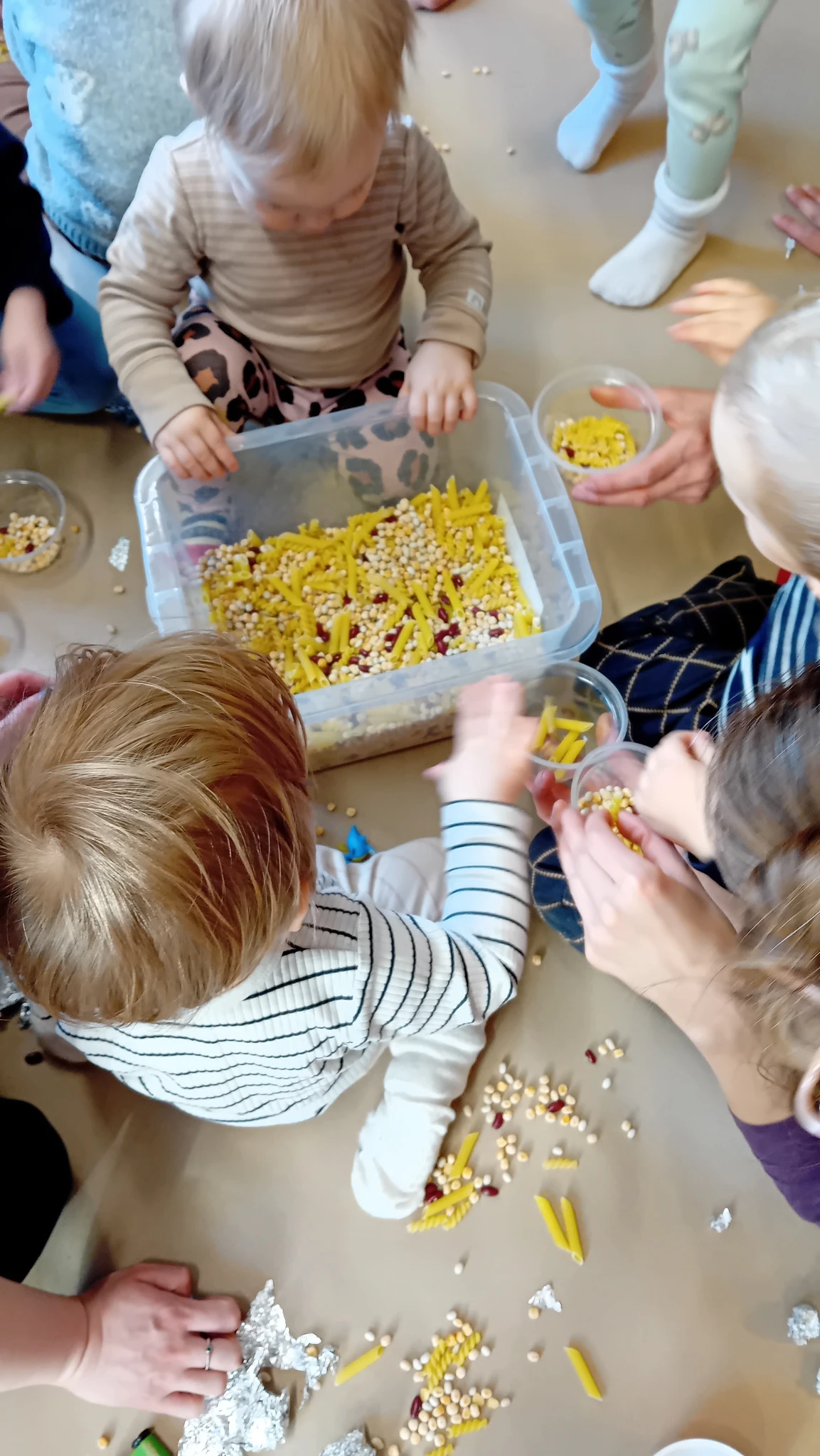 Meie alustasime harutamisest. Harutasime fooliumi seest lahti suure hulga erinevaid figuure, vaatasime ja sättisime neid pikkuse ja värvide järgi hulkadesse. Seejärel sorteerisime ubade ja herneste hulgast välja makarone ja pakkisime neid fooliumisse, see oli päris keeruline töö.