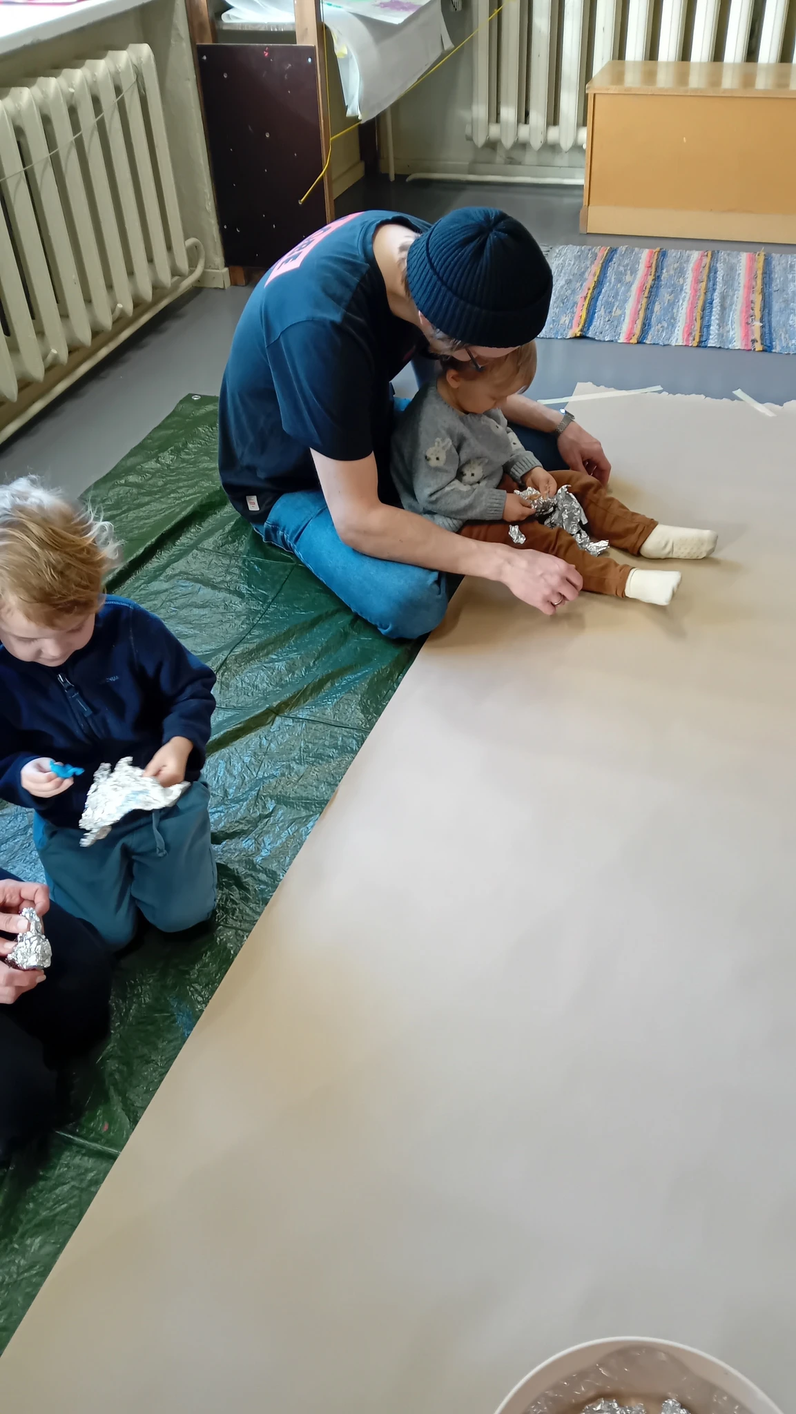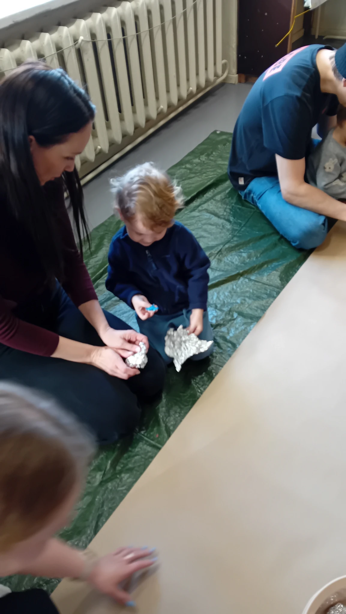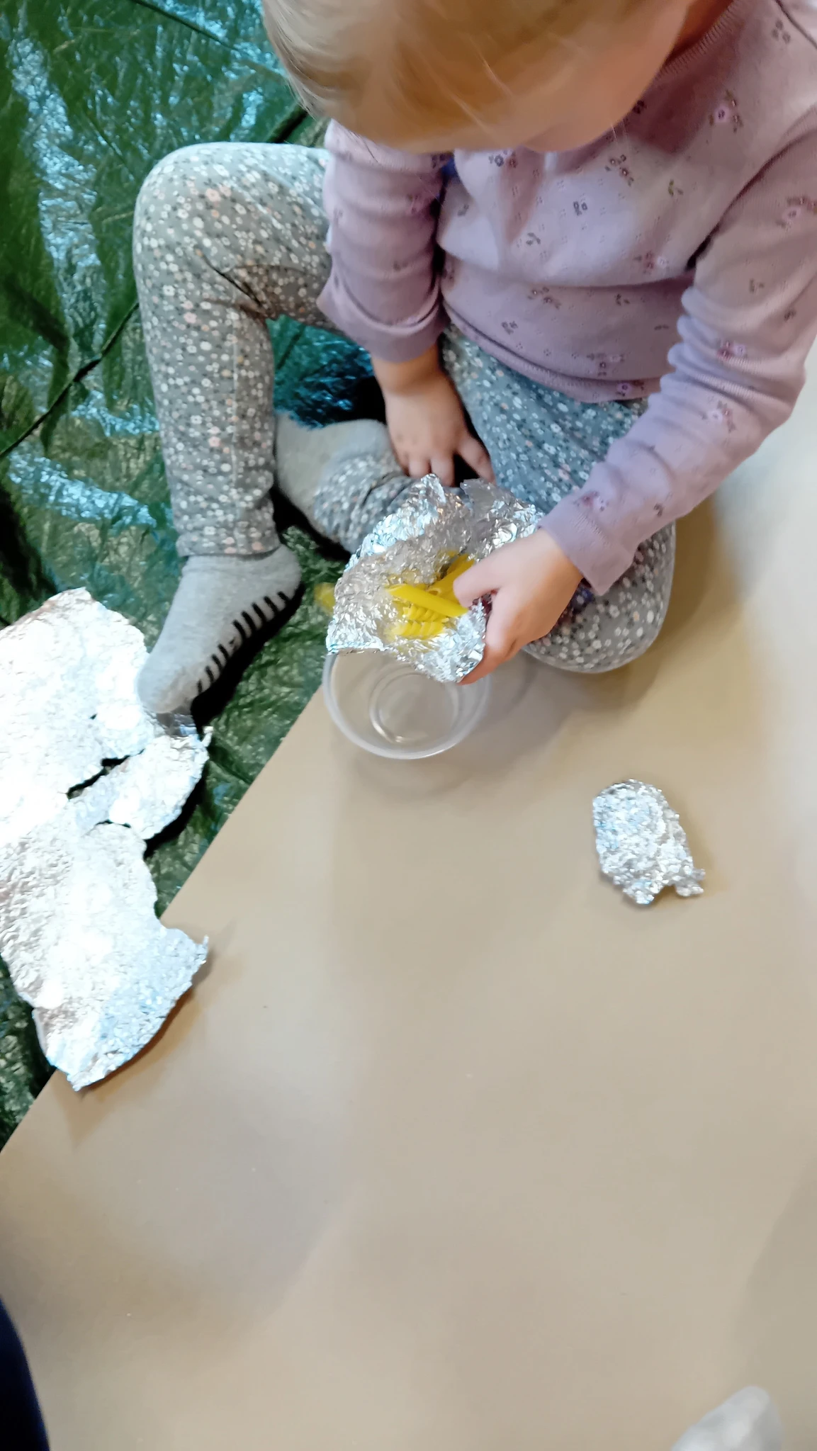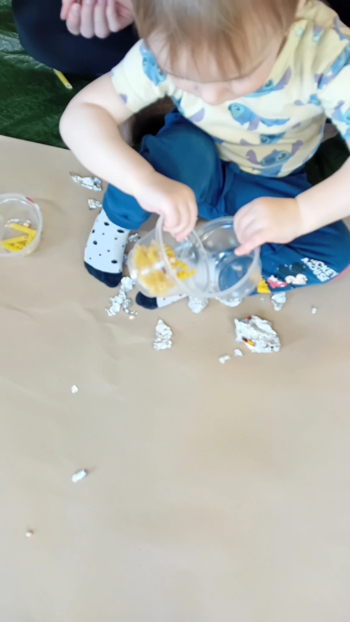 Meie alustasime harutamisest. Harutasime fooliumi seest lahti suure hulga erinevaid figuure, vaatasime ja sättisime neid pikkuse ja värvide järgi hulkadesse. Seejärel sorteerisime ubade ja herneste hulgast välja makarone ja pakkisime neid fooliumisse, see oli päris keeruline töö.