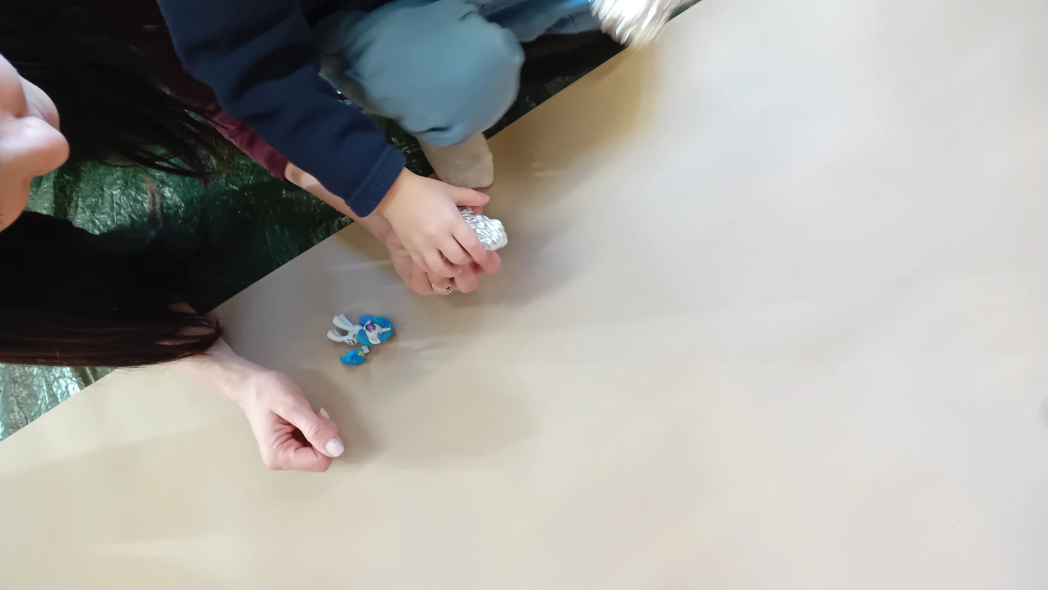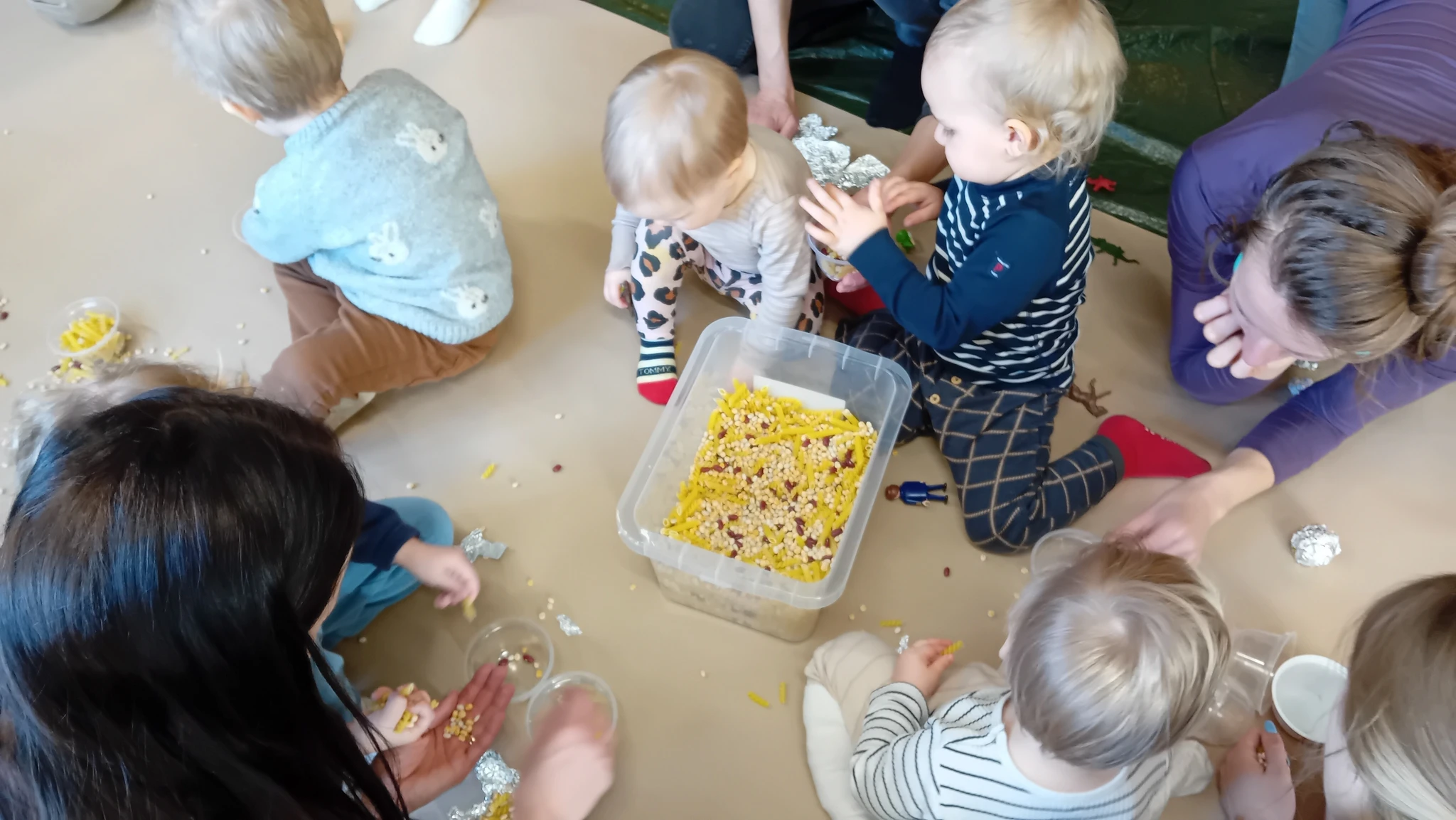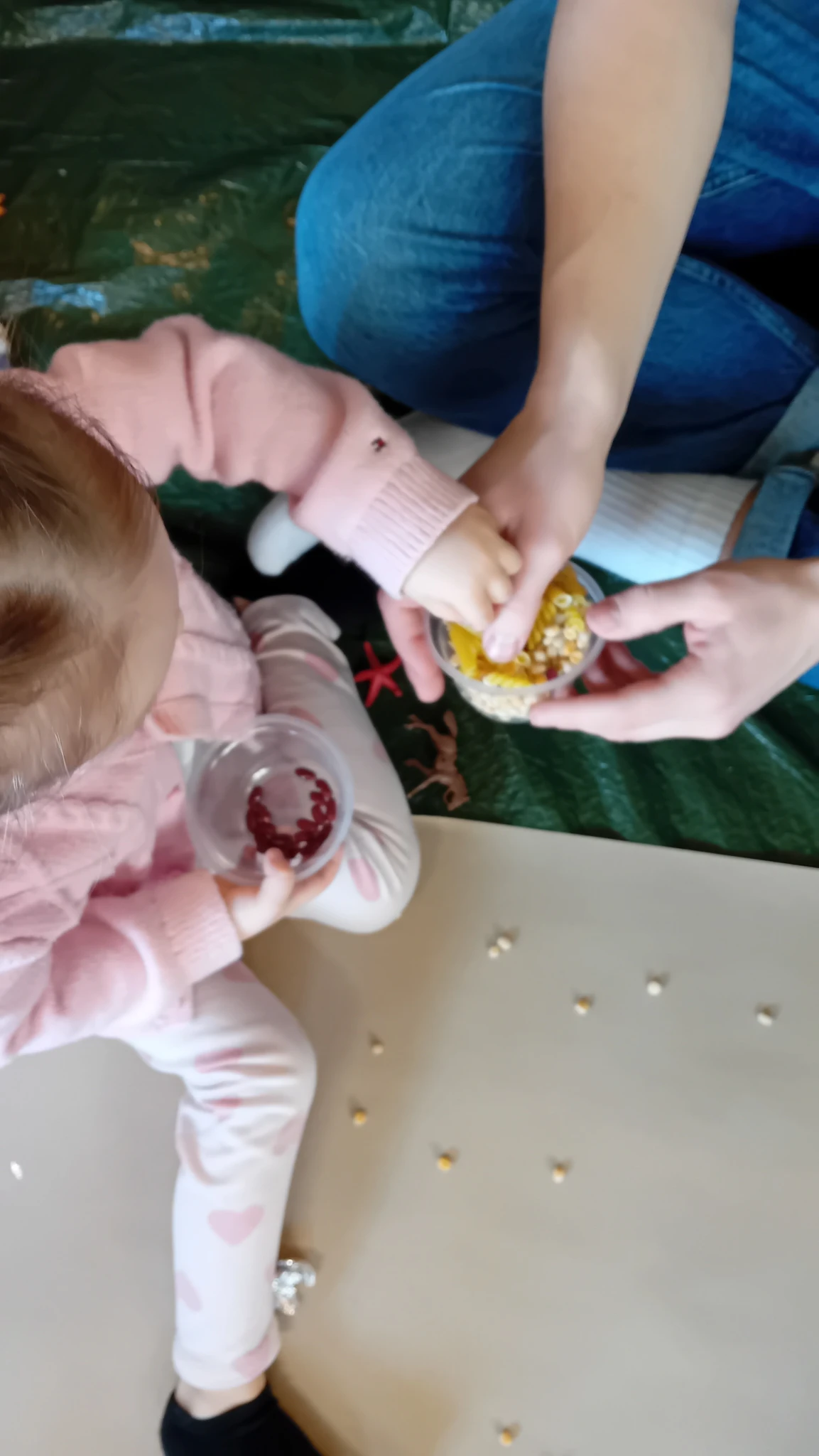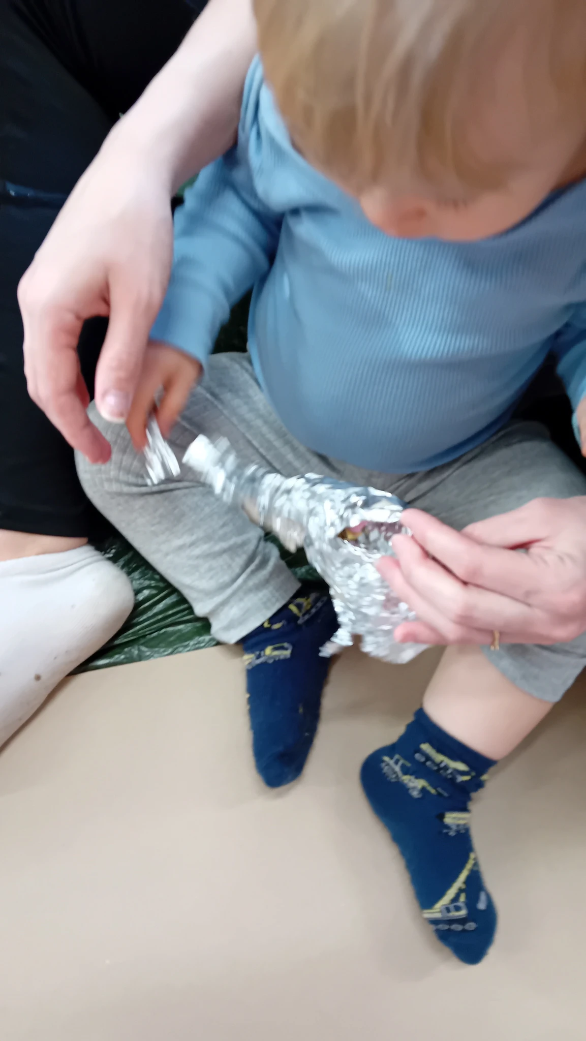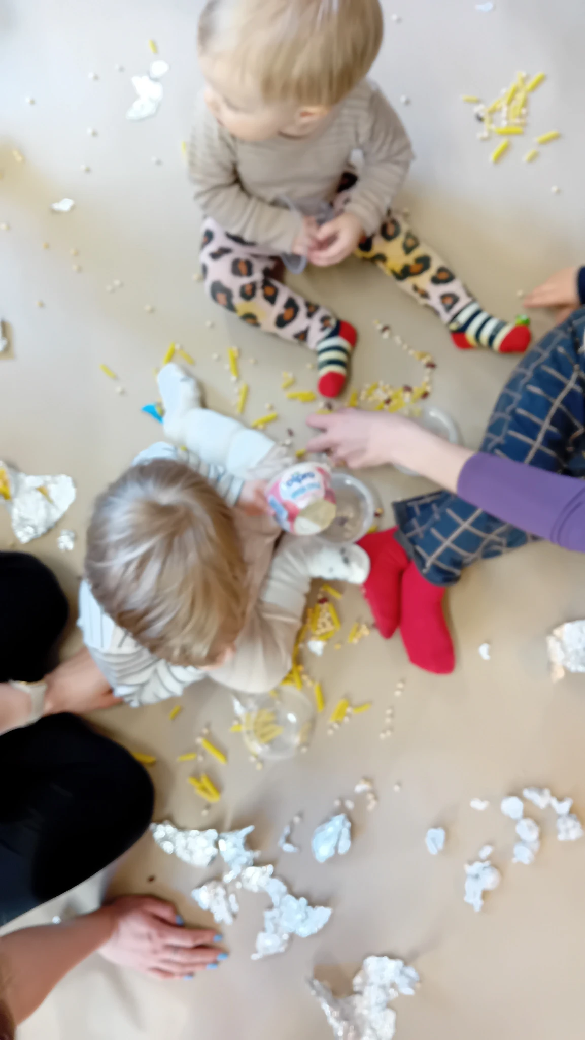 Meie alustasime harutamisest. Harutasime fooliumi seest lahti suure hulga erinevaid figuure, vaatasime ja sättisime neid pikkuse ja värvide järgi hulkadesse. Seejärel sorteerisime ubade ja herneste hulgast välja makarone ja pakkisime neid fooliumisse, see oli päris keeruline töö.