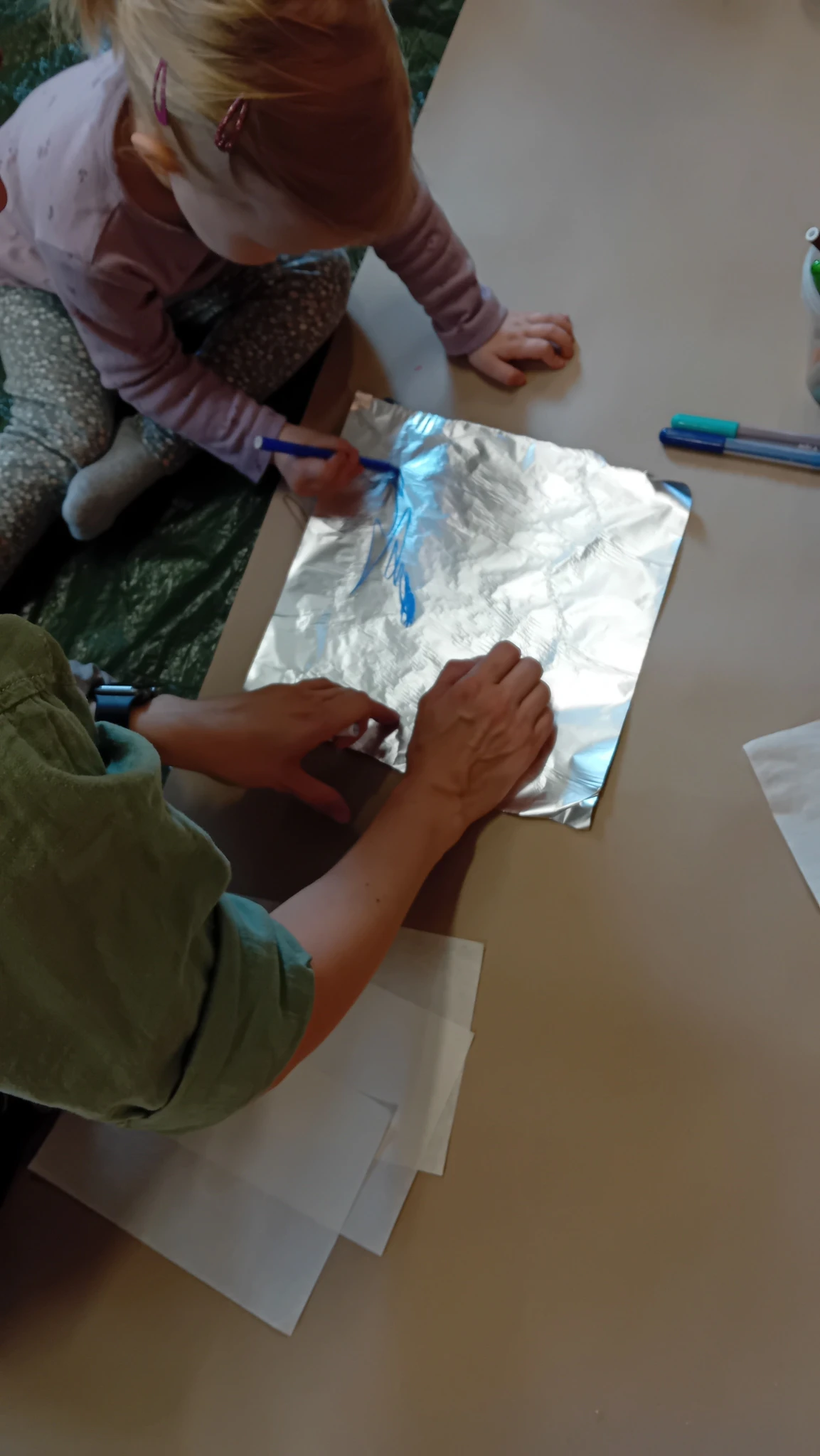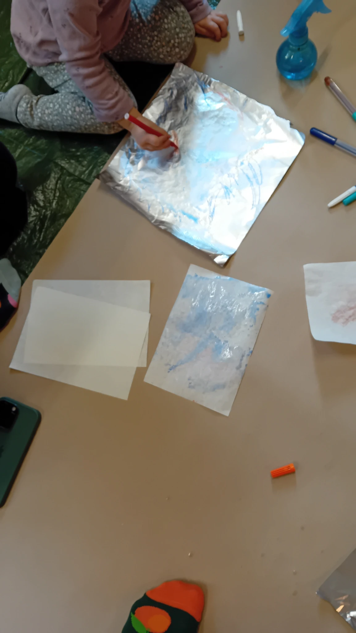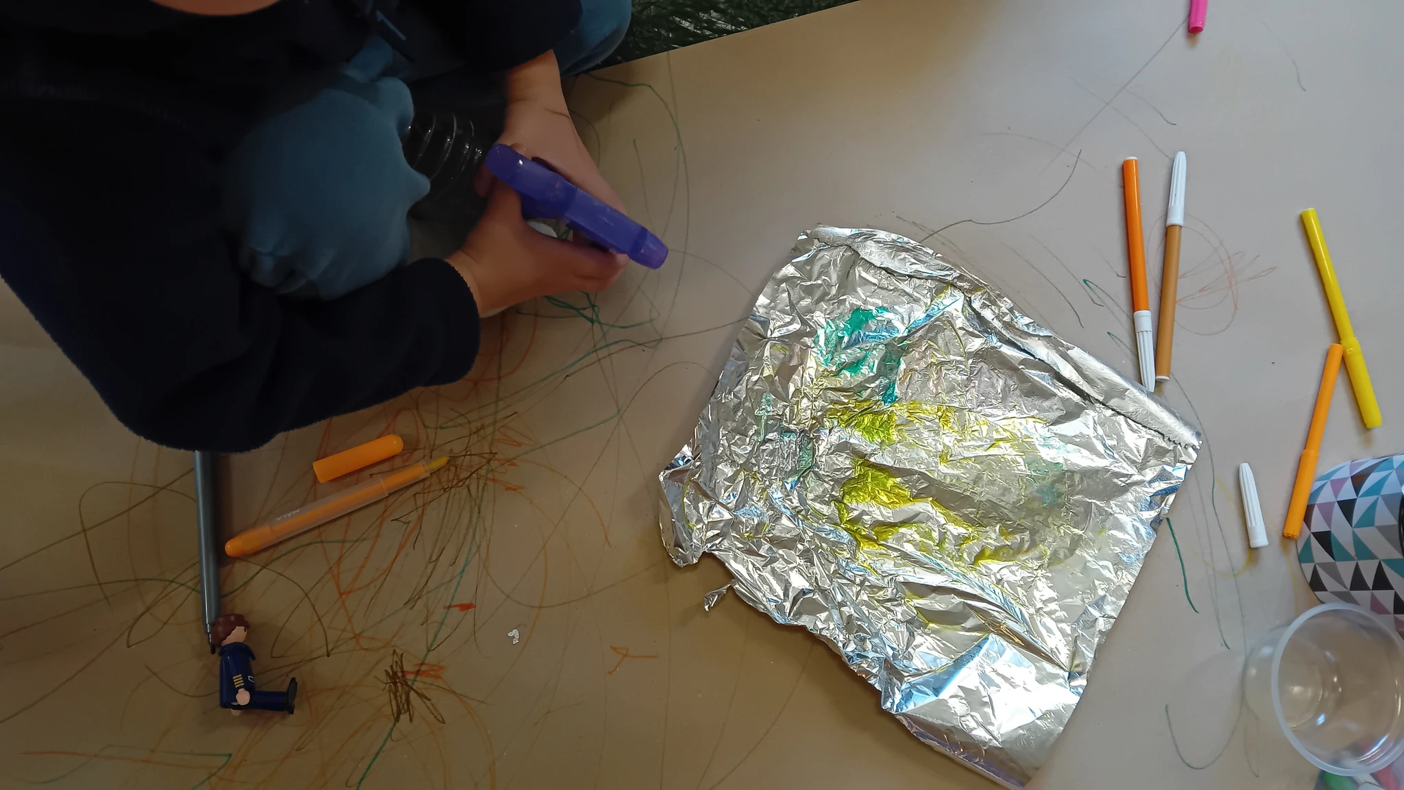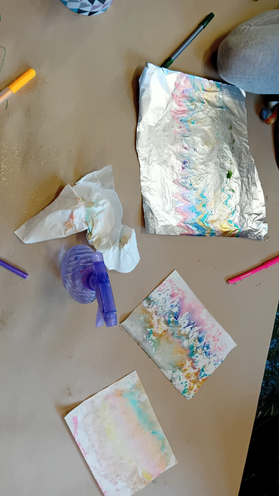 Lõpuks püüdsime fooliumi peale vildikatega joonistada ja seejärel pritsisime pildi märjaks ning "trükkisime" paberile. See oli vähemasti sama põnev kui üllatusmuna avamine!