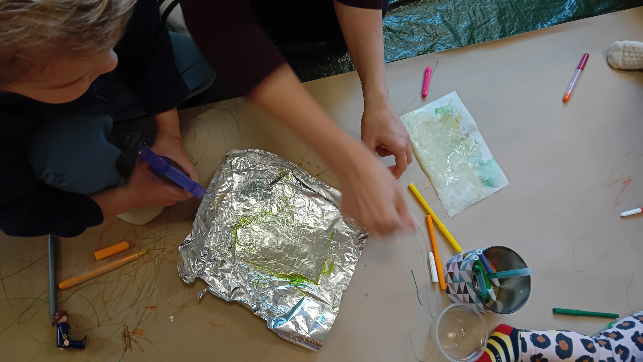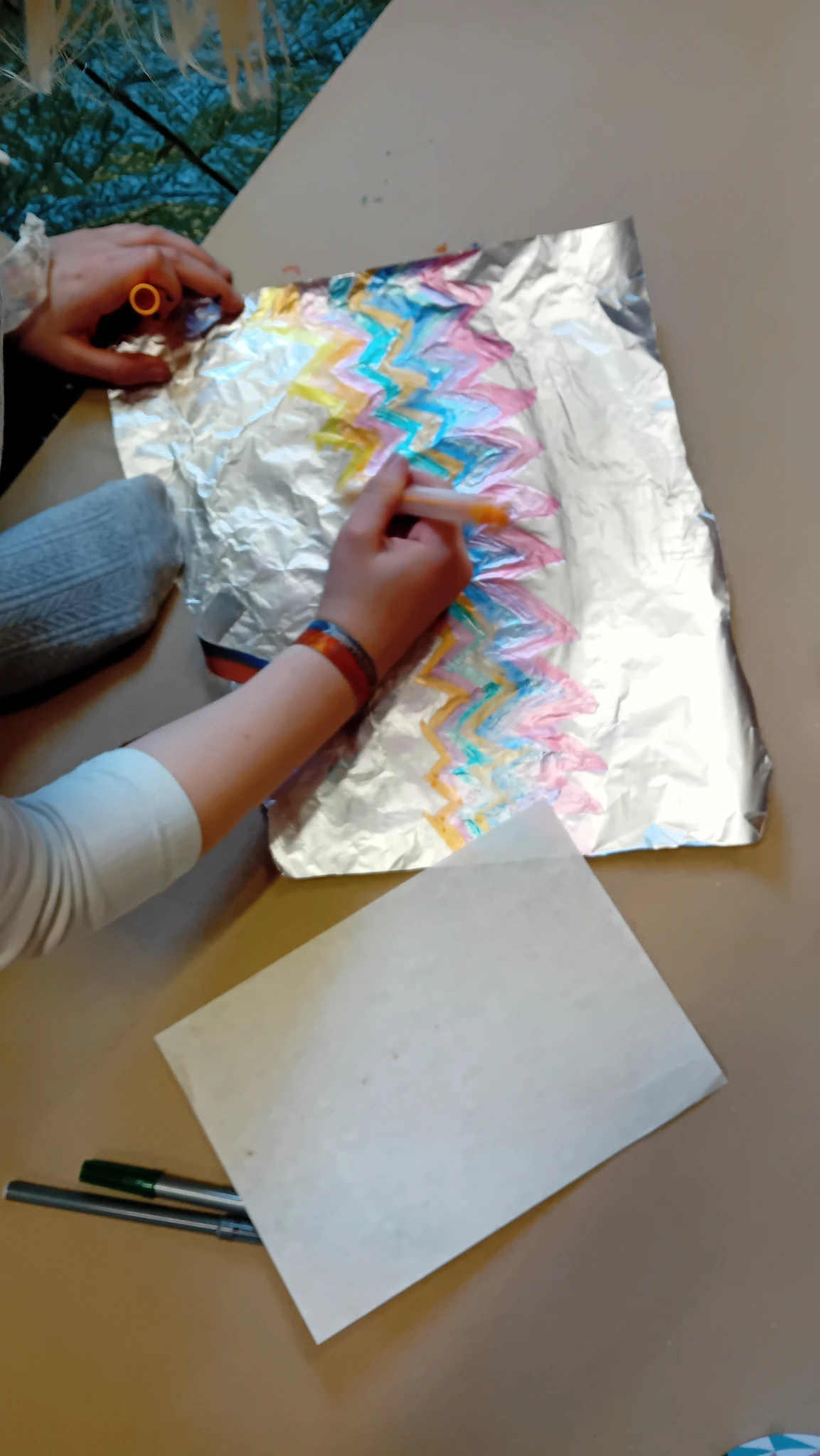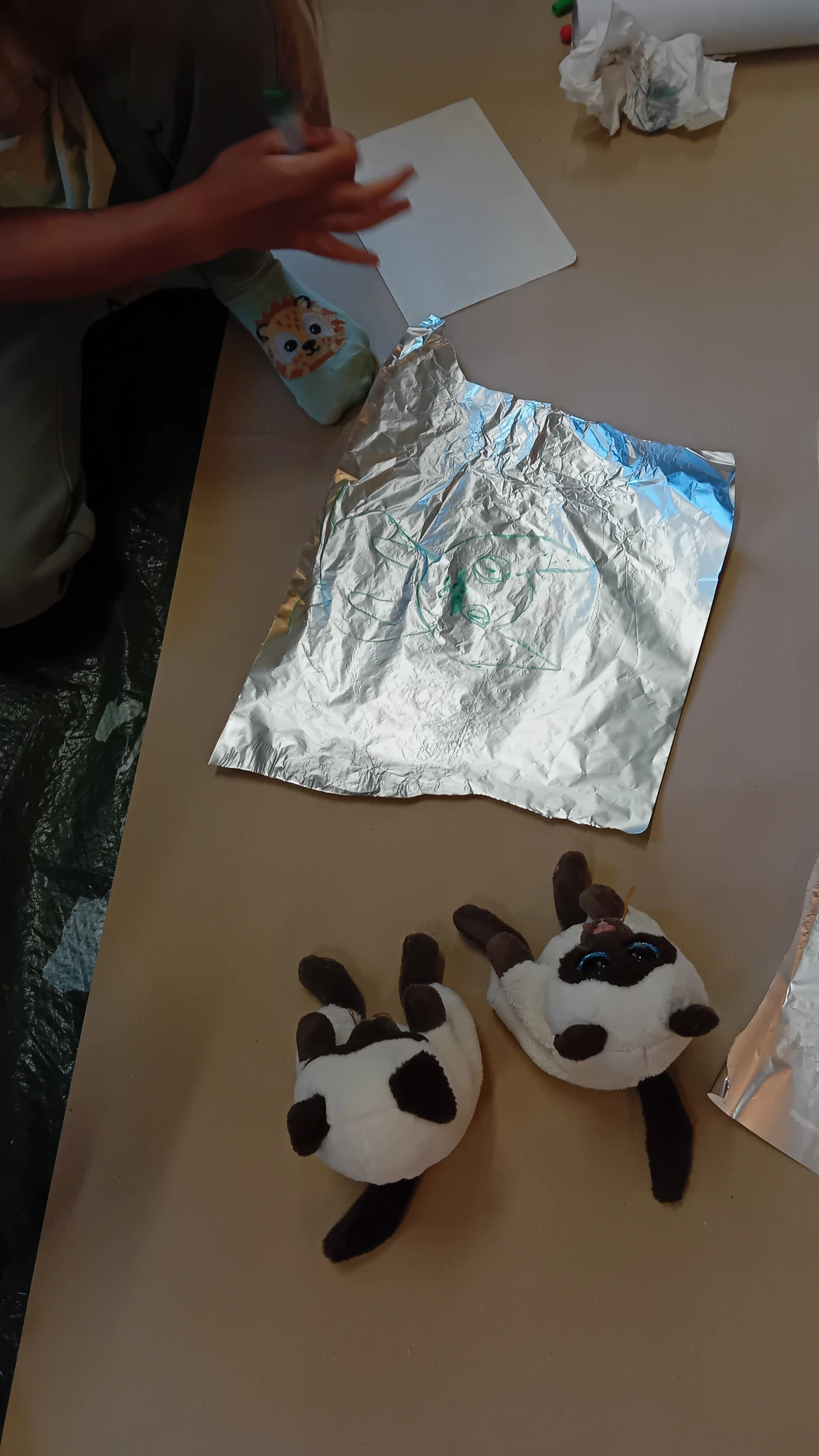 Lõpuks püüdsime fooliumi peale vildikatega joonistada ja seejärel pritsisime pildi märjaks ning "trükkisime" paberile. See oli vähemasti sama põnev kui üllatusmuna avamine!