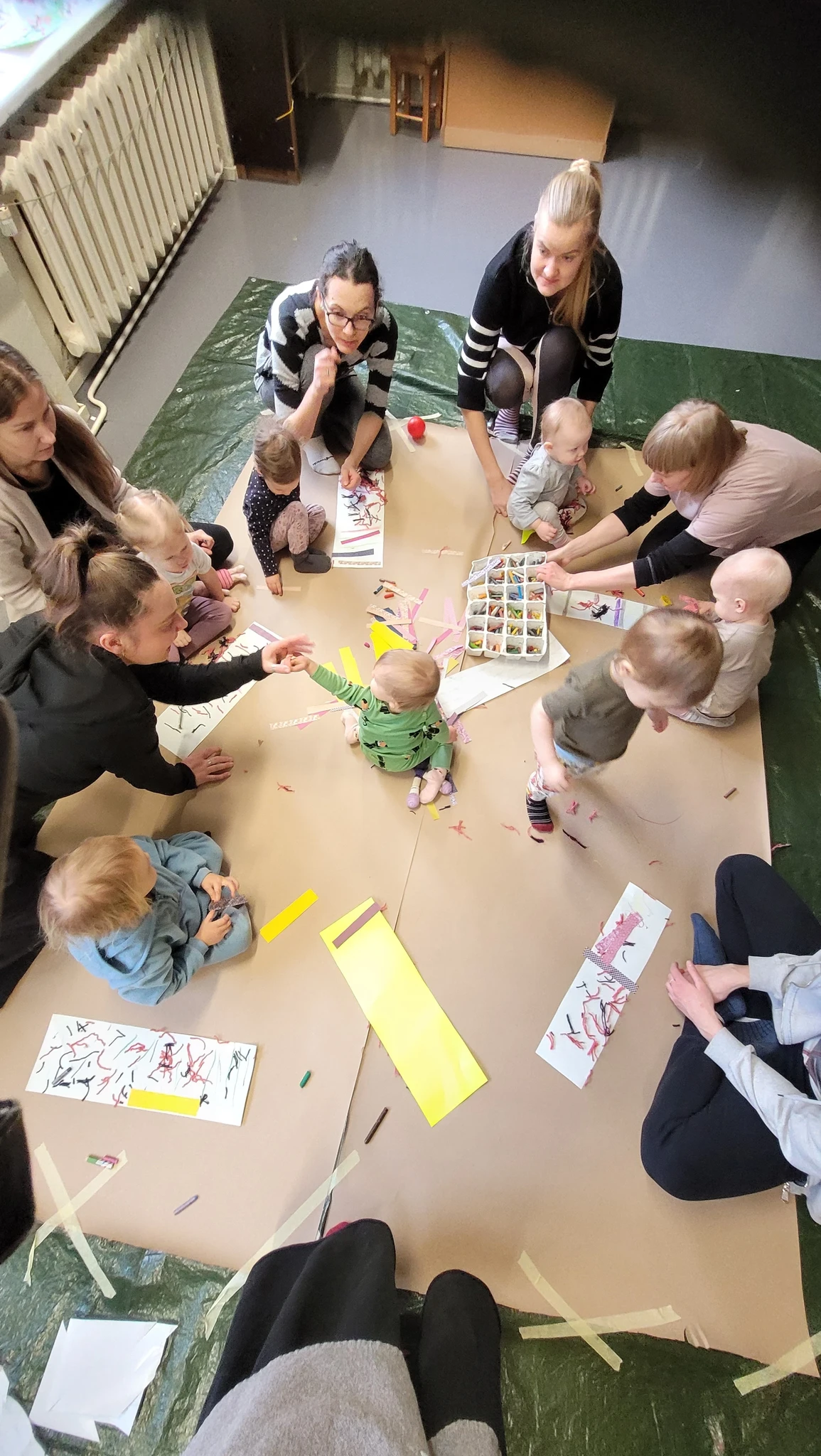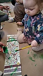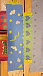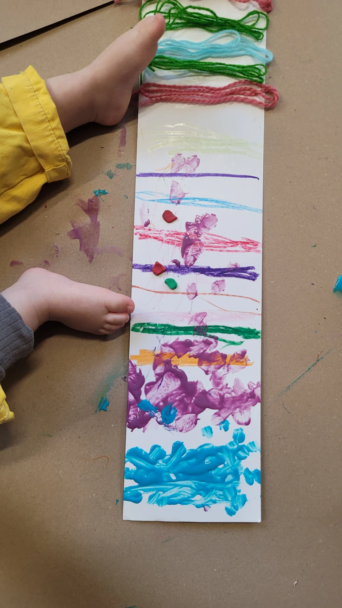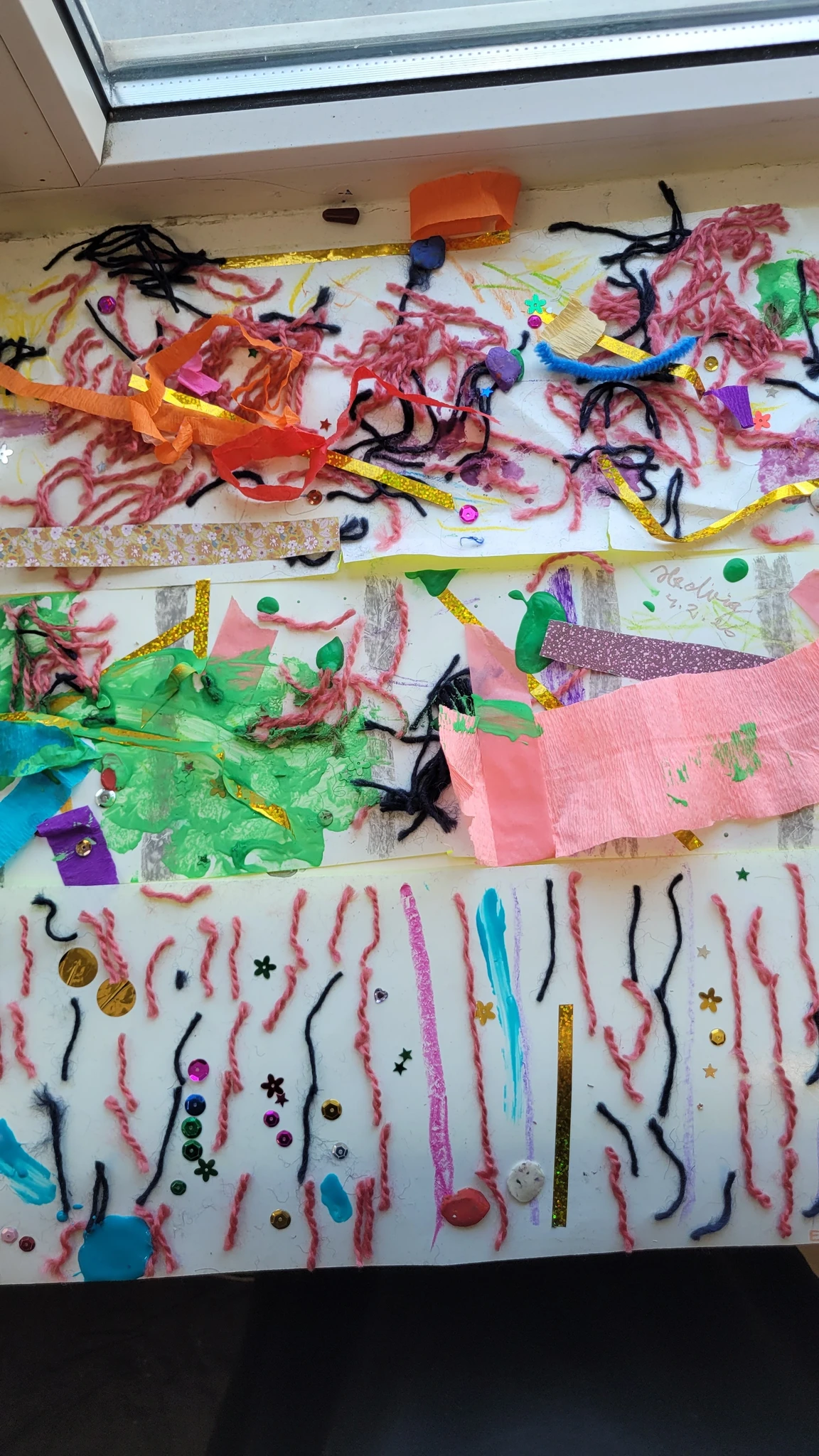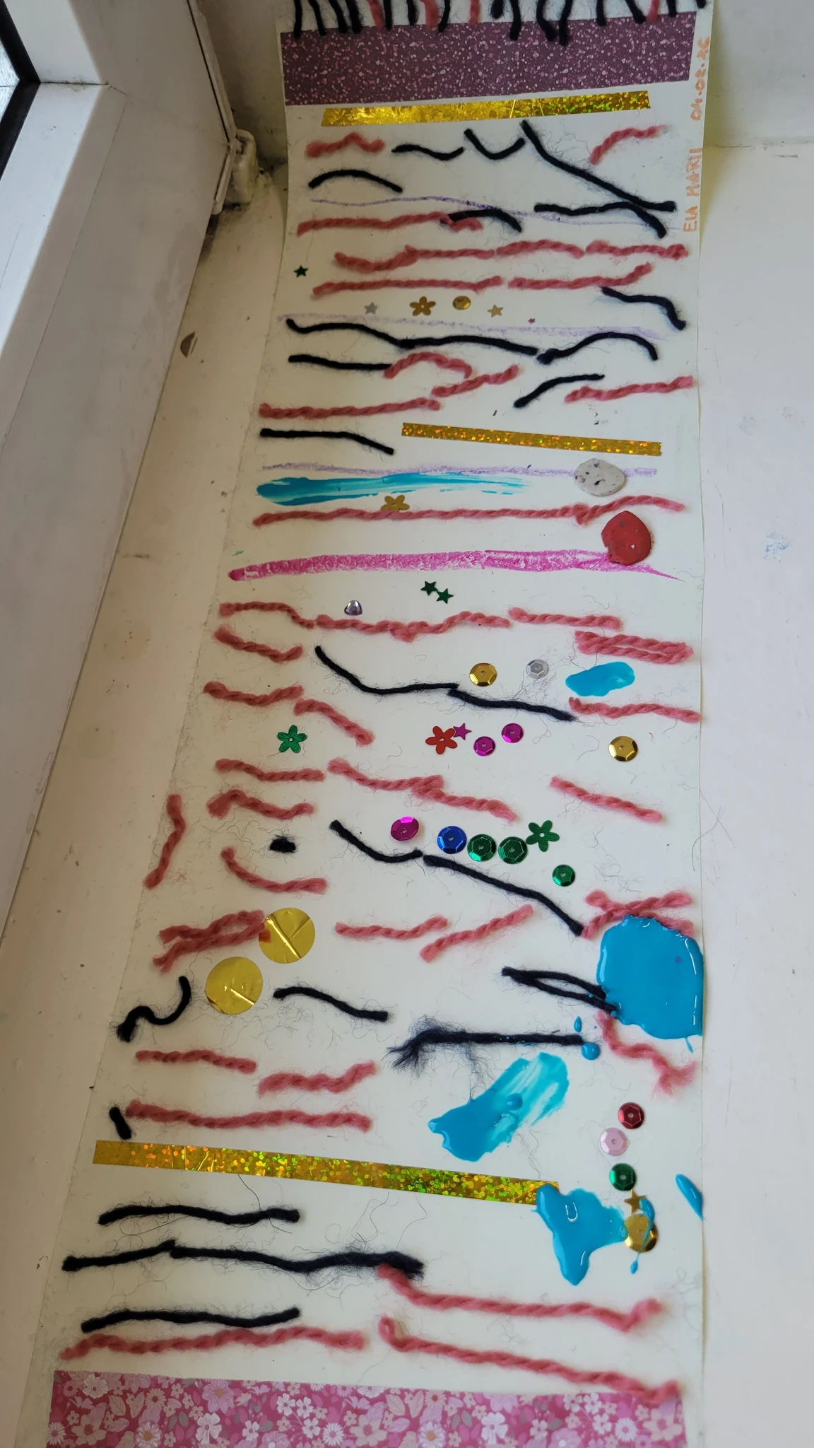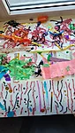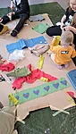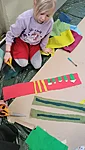 Nüüd alustasime ise sallide tegemisega. Või siis sallide kavanditega. Alustuseks kordasime üle, et millised asjad on triibud! Sallid on tihti triibulised ja seega proovisime leida üles triipusid erinevate kangaste pealt ruumis. Vaatasime kas teeme triibul ja ruudul vahet. Järgmisena saime pika pabeririba ja rasvakriidid ja hakkasime paberit triibutama, lisaks liimisime sinna peale paberist triipe ja lõngajuppe. Väiksemad lapsed said liimimise asemel kasutada kleepsupaberit, millele me asju peale asetasime. Lisasime ka veidi sädelevaid litreid ning krepp paberi ribasid ja beebid said lisaks lõpus hirsiterasid laiali pudistada. Sallid said uhked ja värvilised ja nüüd oleks hea edastada need kavandid vanaemale, et ta kooks selle järgi päris salli ;)