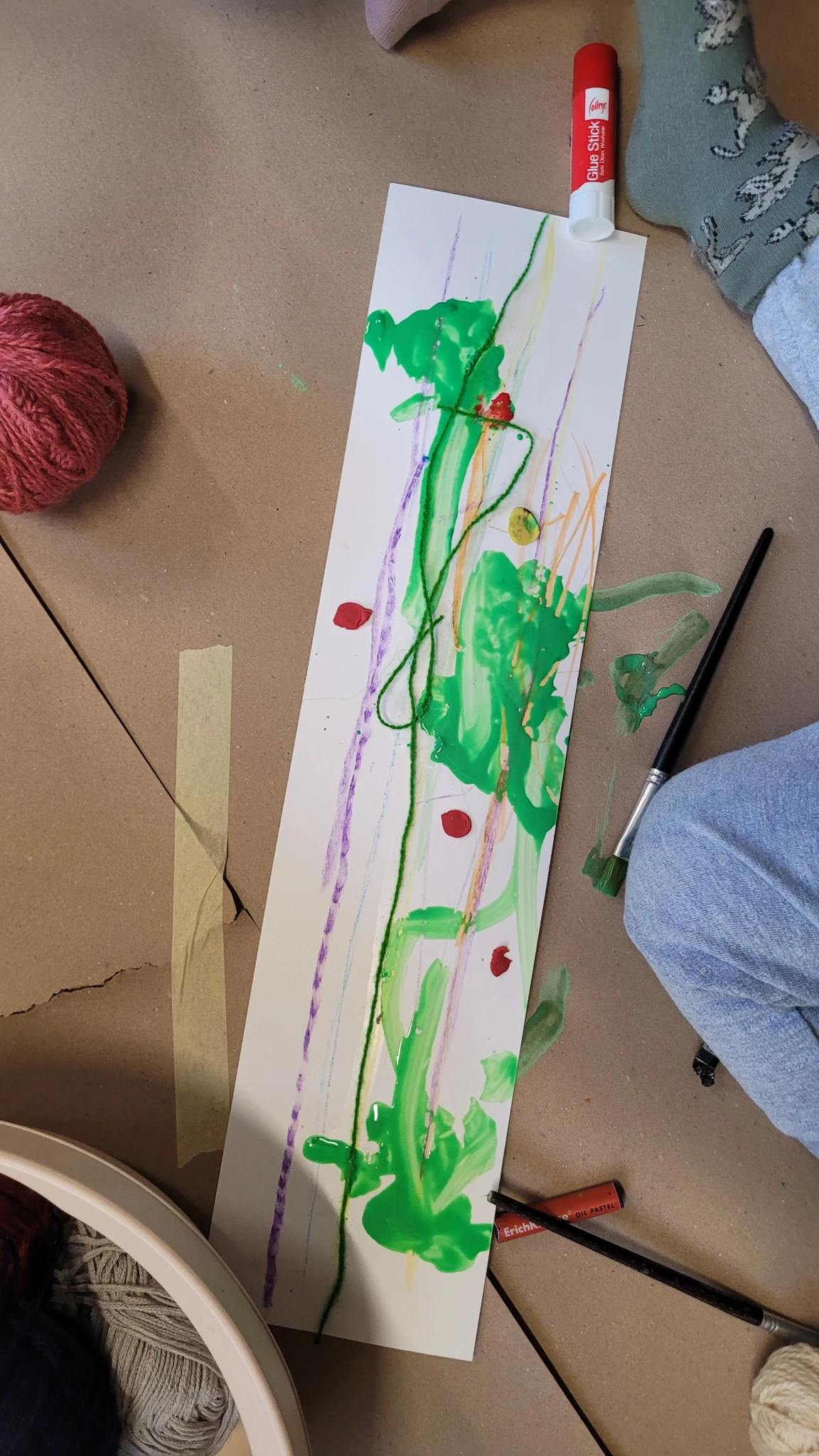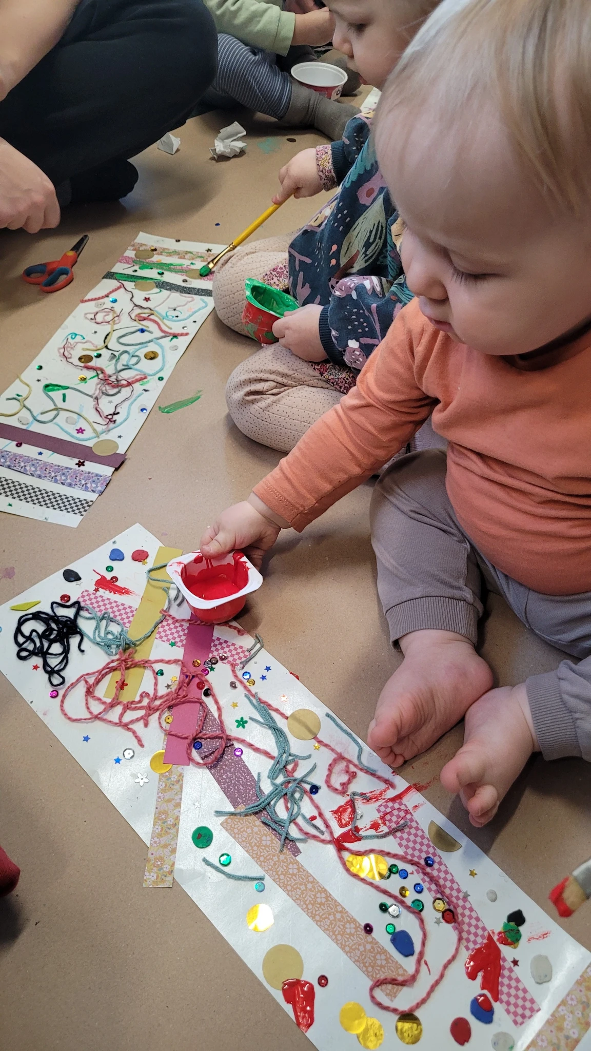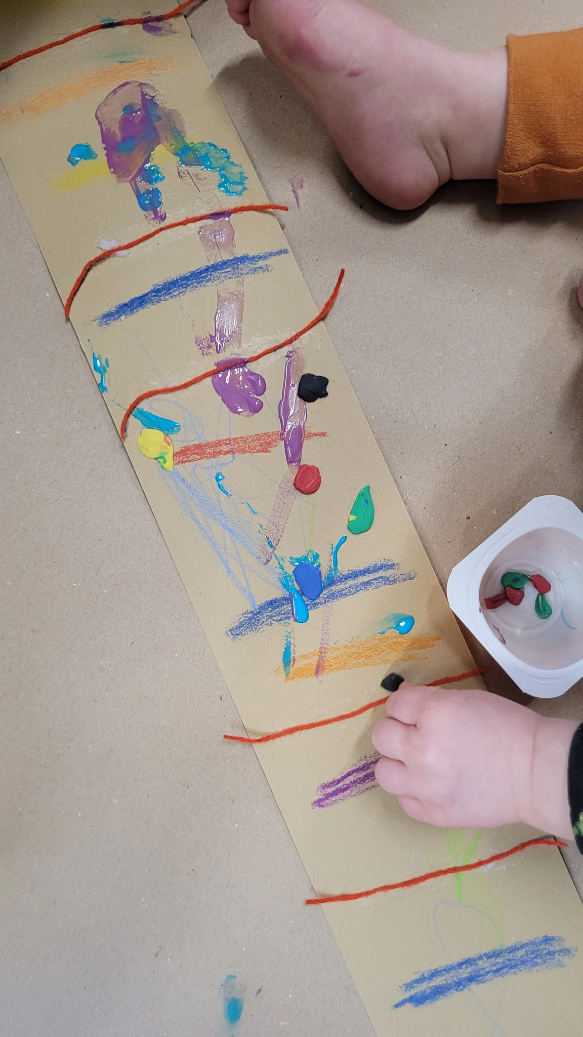 Nüüd alustasime ise sallide tegemisega. Või siis sallide kavanditega. Alustuseks kordasime üle, et millised asjad on triibud! Sallid on tihti triibulised ja seega proovisime leida üles triipusid erinevate kangaste pealt ruumis. Vaatasime kas teeme triibul ja ruudul vahet. Järgmisena saime pika pabeririba ja rasvakriidid ja hakkasime paberit triibutama, lisaks liimisime sinna peale paberist triipe ja lõngajuppe. Väiksemad lapsed said liimimise asemel kasutada kleepsupaberit, millele me asju peale asetasime. Lisasime ka veidi sädelevaid litreid ning krepp paberi ribasid ja beebid said lisaks lõpus hirsiterasid laiali pudistada. Sallid said uhked ja värvilised ja nüüd oleks hea edastada need kavandid vanaemale, et ta kooks selle järgi päris salli ;)