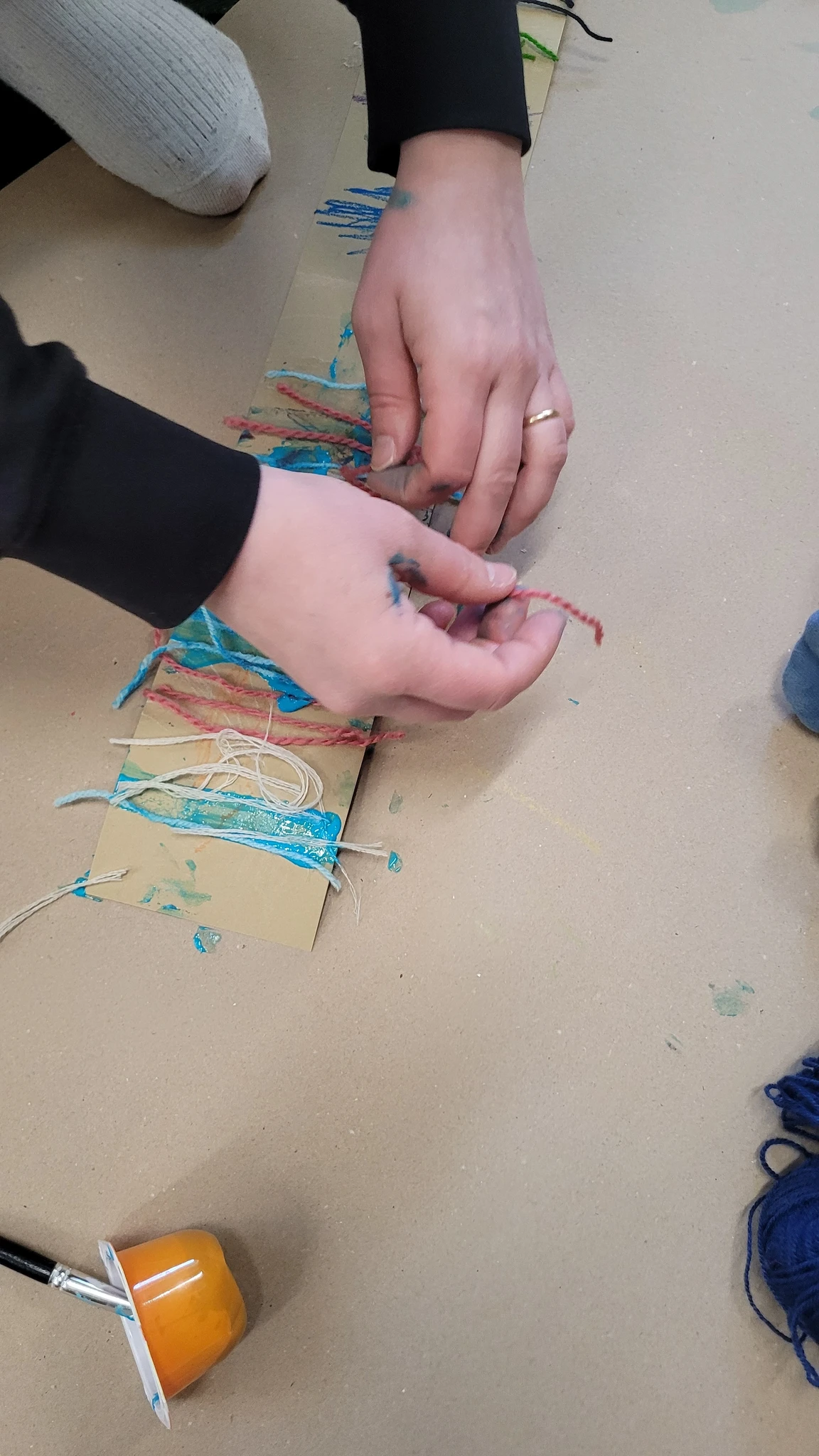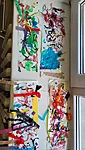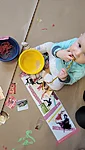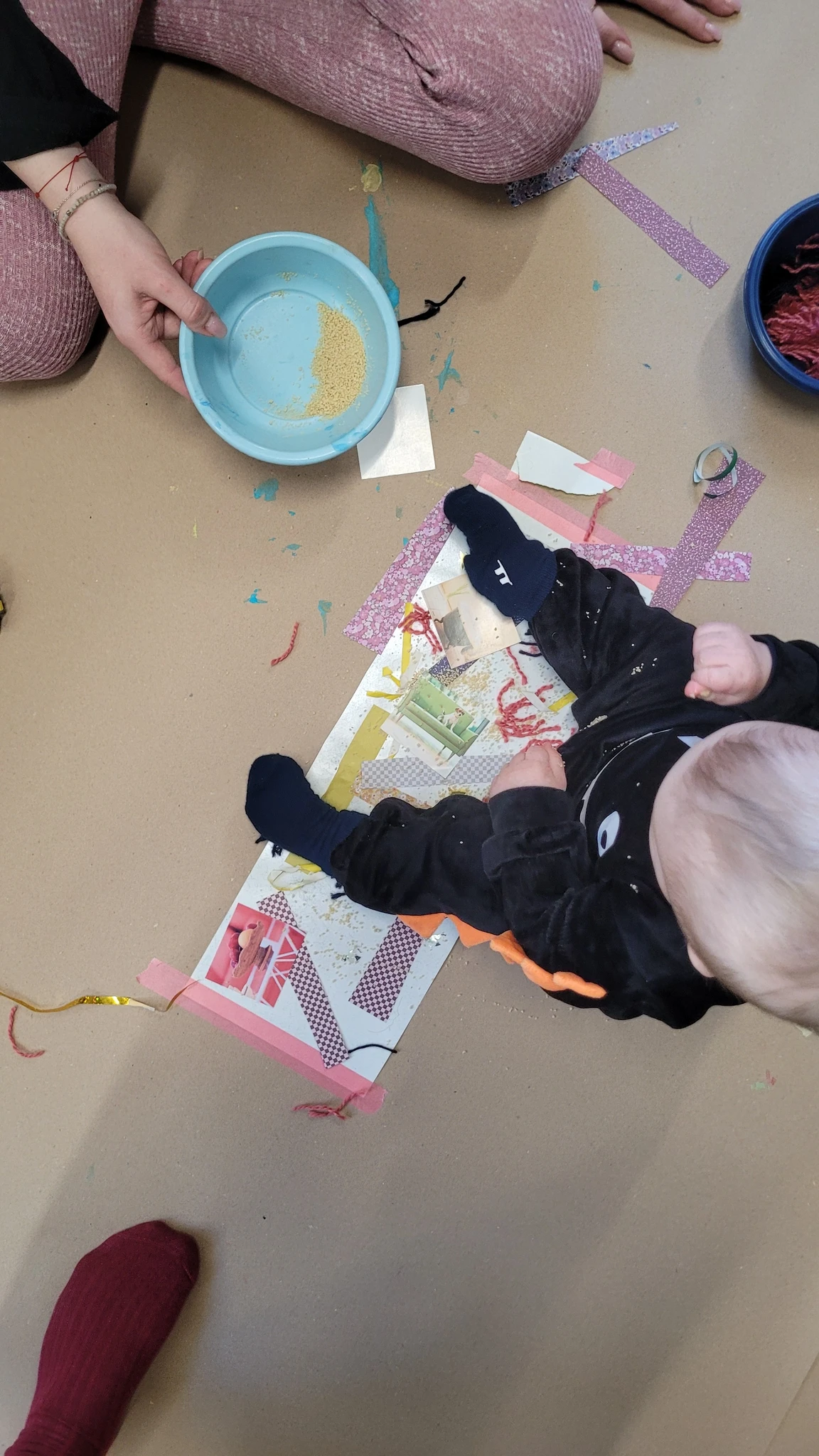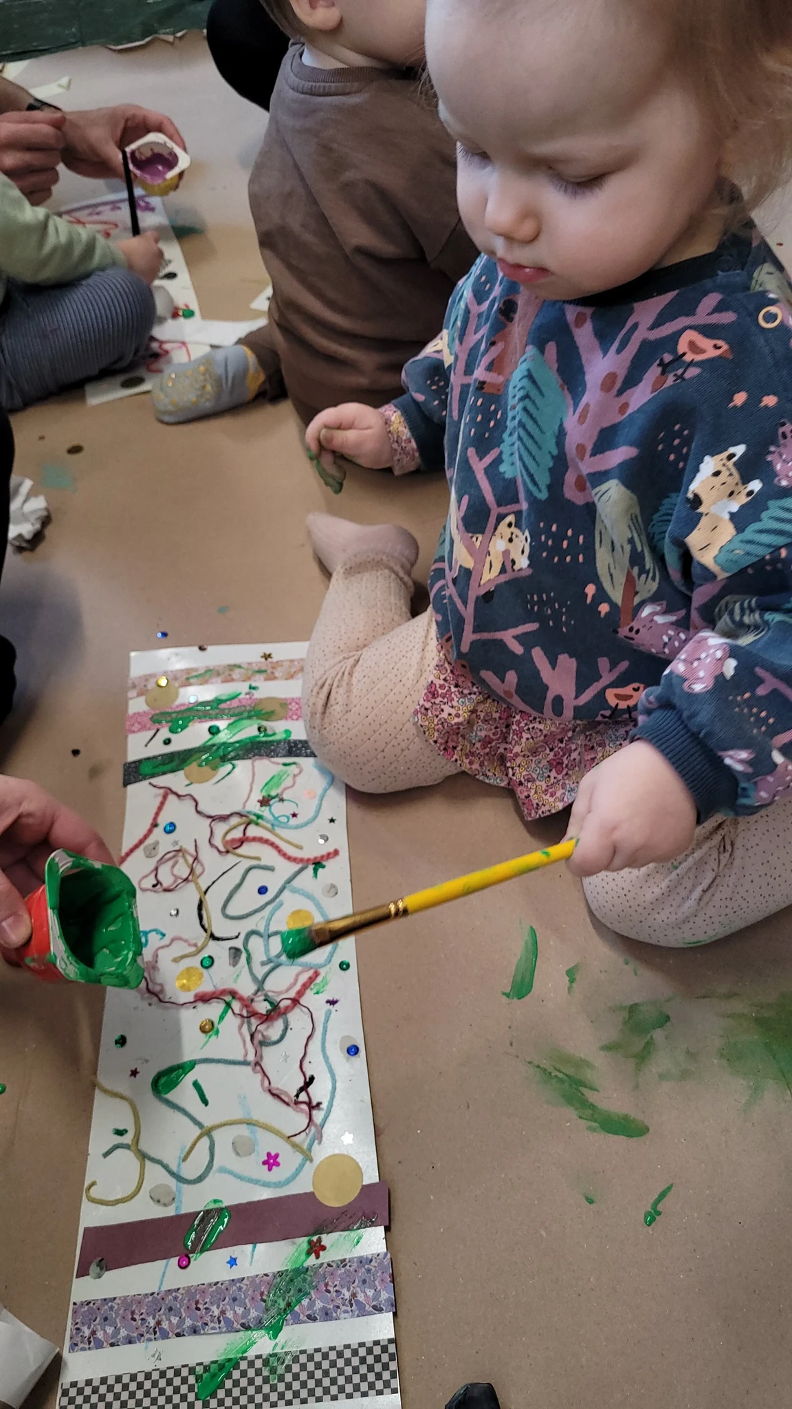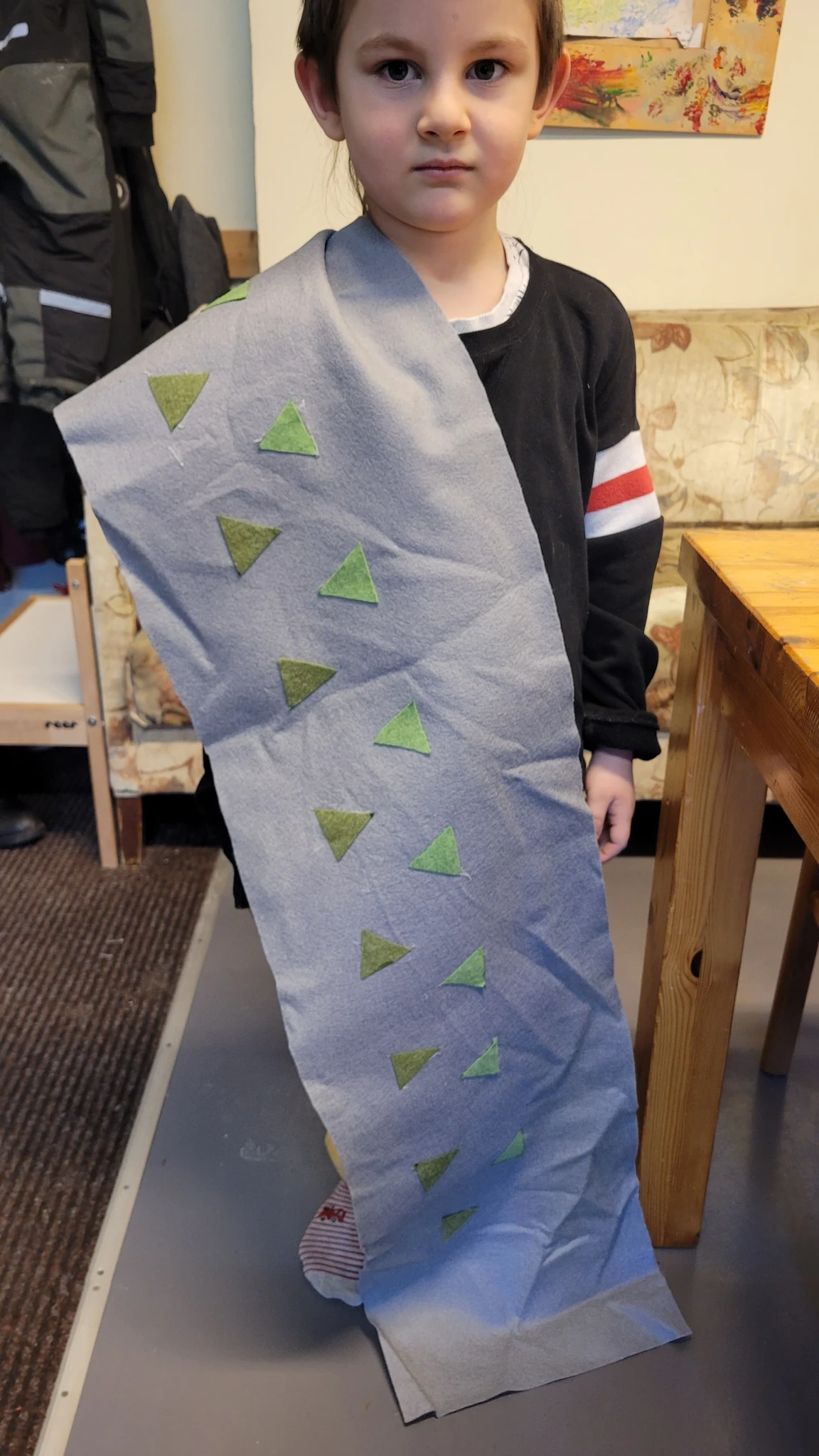 Nüüd alustasime ise sallide tegemisega. Või siis sallide kavanditega. Alustuseks kordasime üle, et millised asjad on triibud! Sallid on tihti triibulised ja seega proovisime leida üles triipusid erinevate kangaste pealt ruumis. Vaatasime kas teeme triibul ja ruudul vahet. Järgmisena saime pika pabeririba ja rasvakriidid ja hakkasime paberit triibutama, lisaks liimisime sinna peale paberist triipe ja lõngajuppe. Väiksemad lapsed said liimimise asemel kasutada kleepsupaberit, millele me asju peale asetasime. Lisasime ka veidi sädelevaid litreid ning krepp paberi ribasid ja beebid said lisaks lõpus hirsiterasid laiali pudistada. Sallid said uhked ja värvilised ja nüüd oleks hea edastada need kavandid vanaemale, et ta kooks selle järgi päris salli ;)