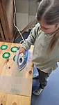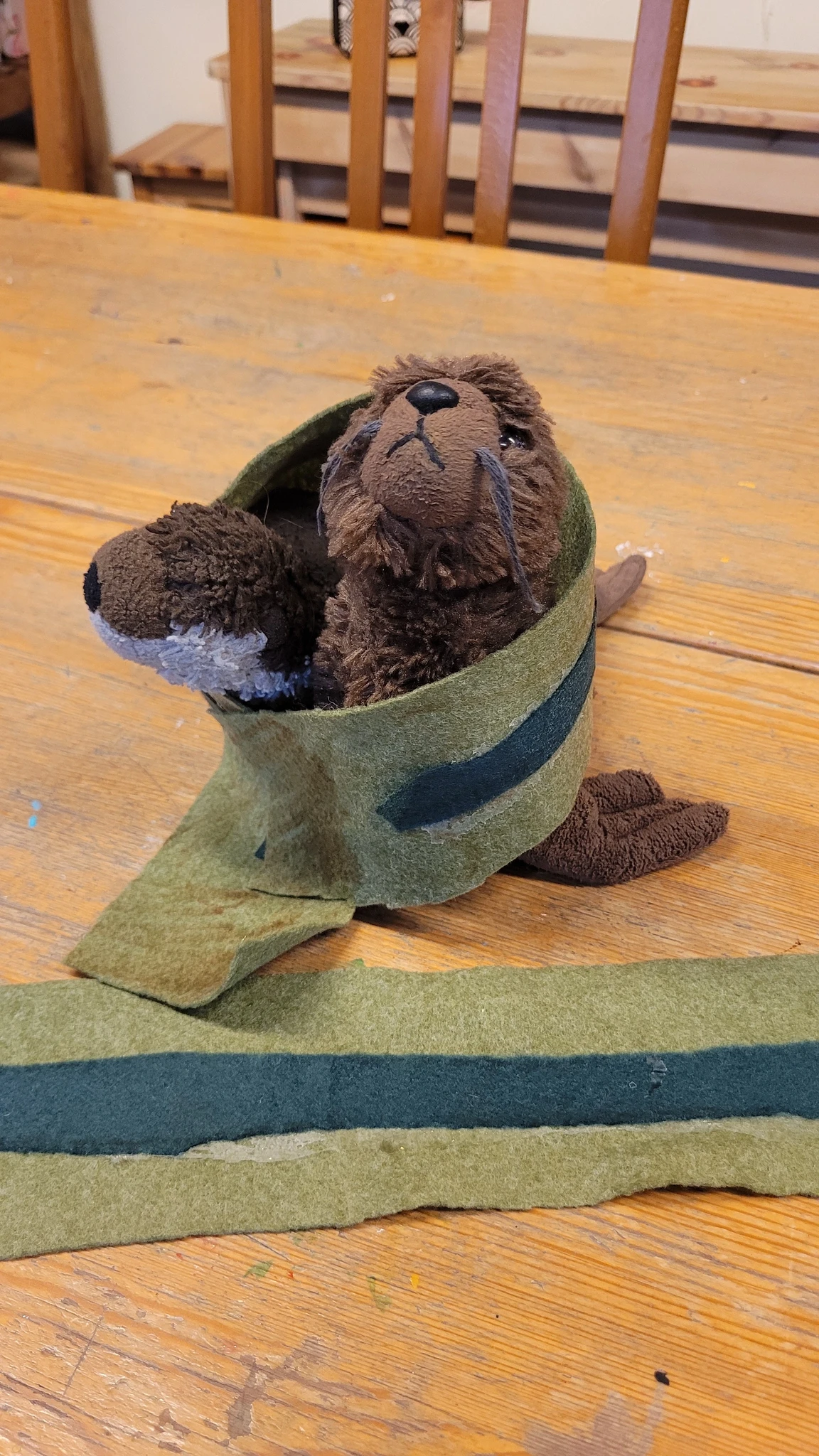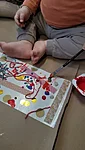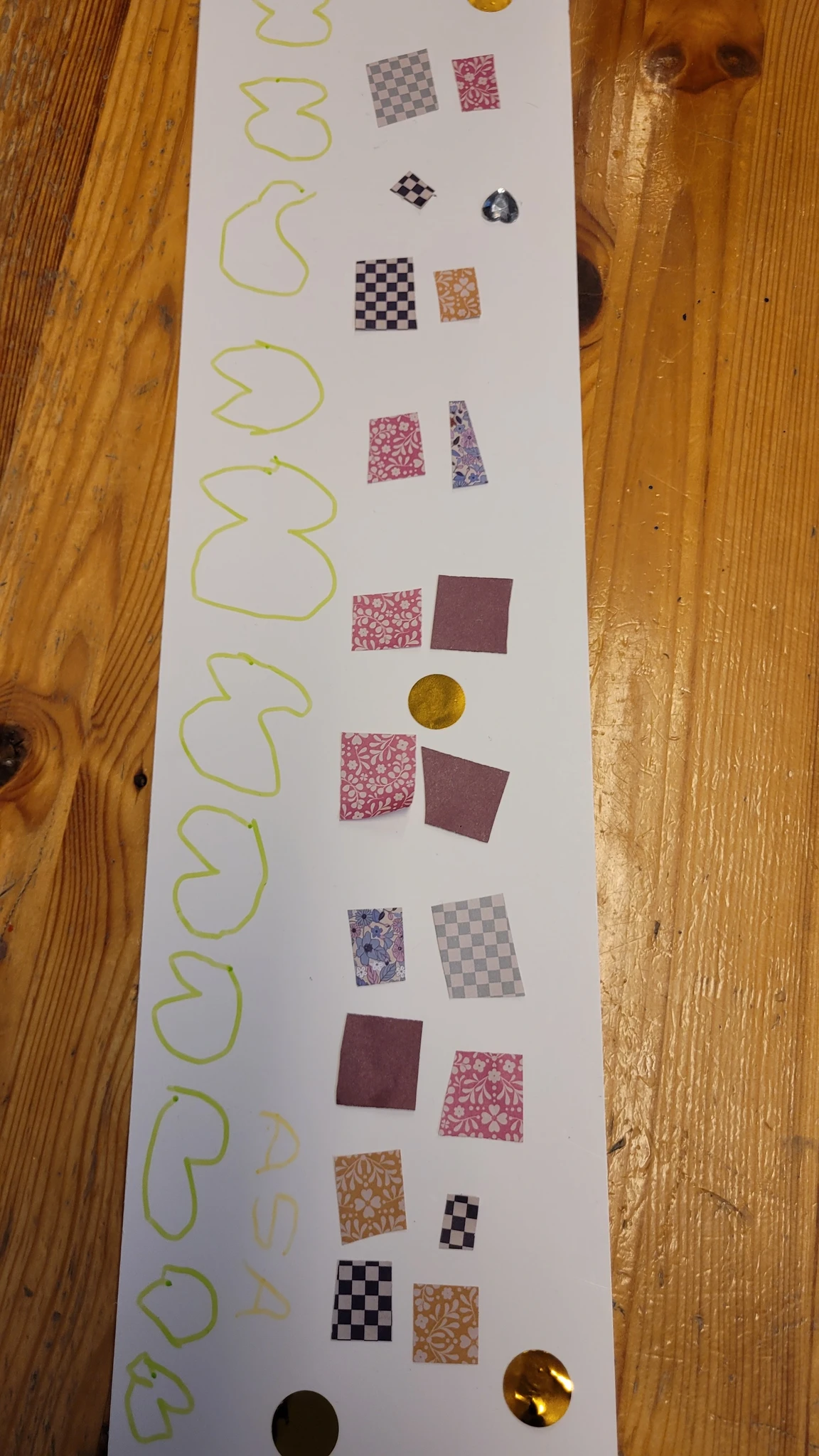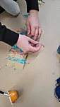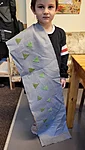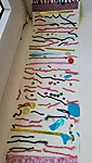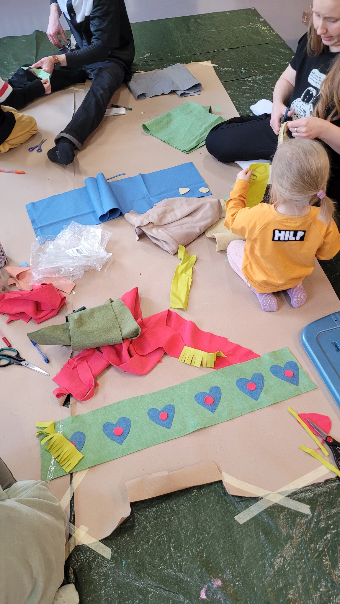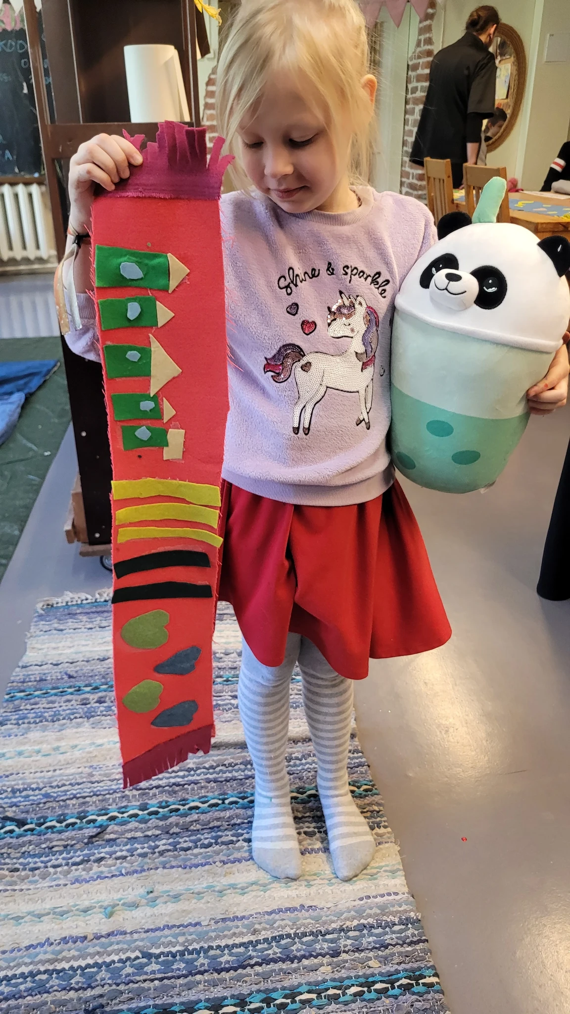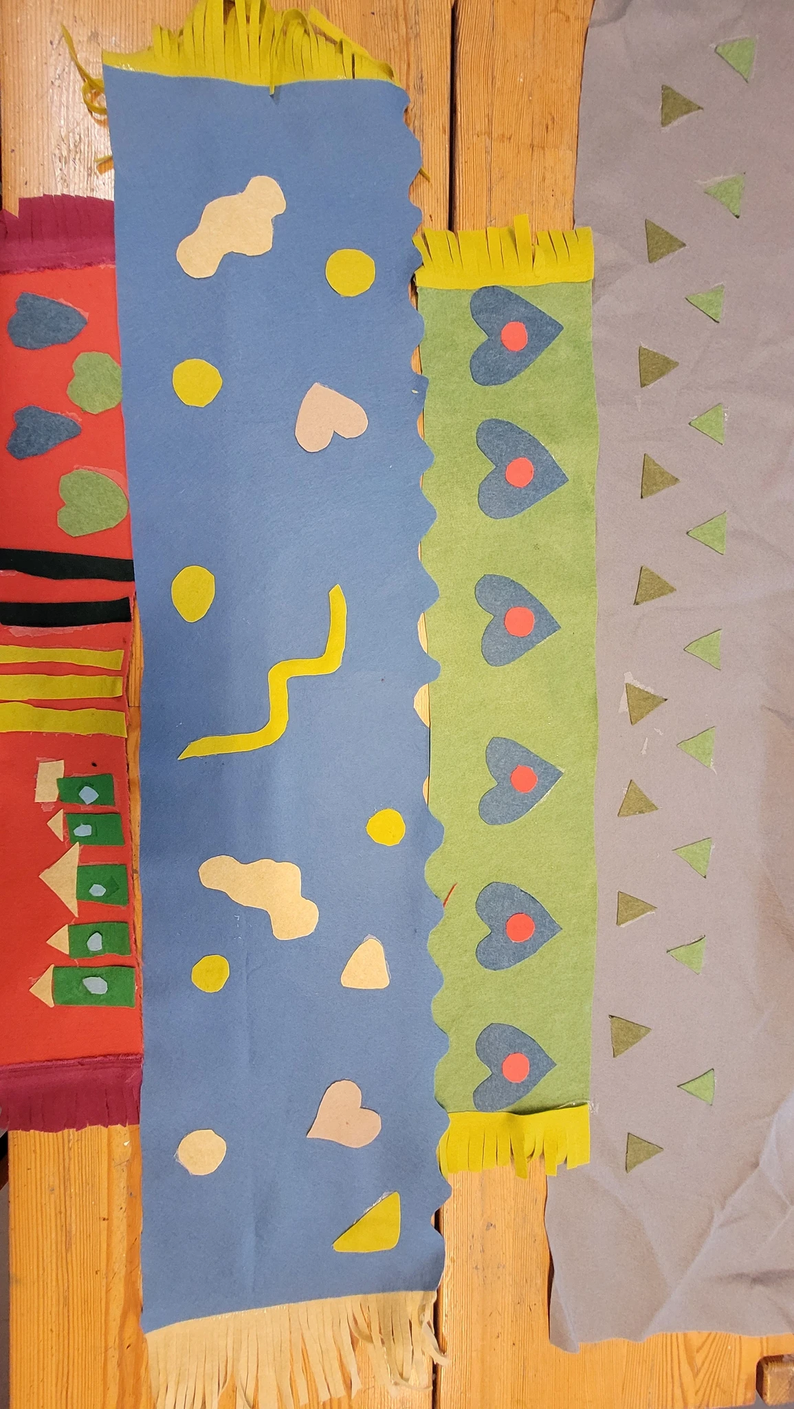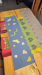 Suuremad meisterdajad aga said ülesandeks kujundada pärsi salli. Lõikasime viltmaterjalist paraja riba ja sinna peale kaunistuseks erinevaid ja erinevat värvi kujundeid. Kujundite järgi lõikasime sama kujuga kiletükid, mille me siis salli külge triikrauaga kinni kuumutasime. Need sallid sai minnes kohe kaela panna ja võis kindel olla, et kellelgi teisel pole Tartu linna peal samasugust :)