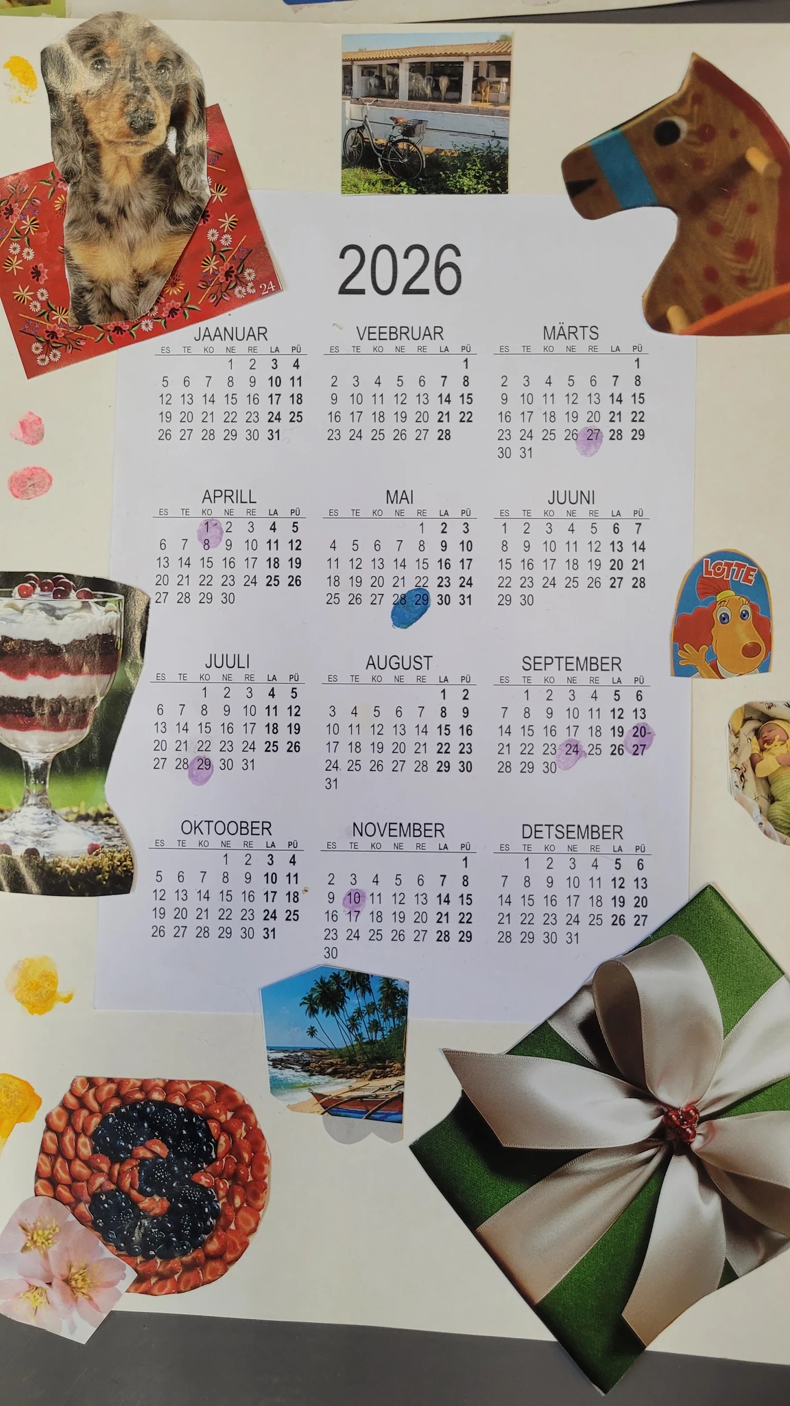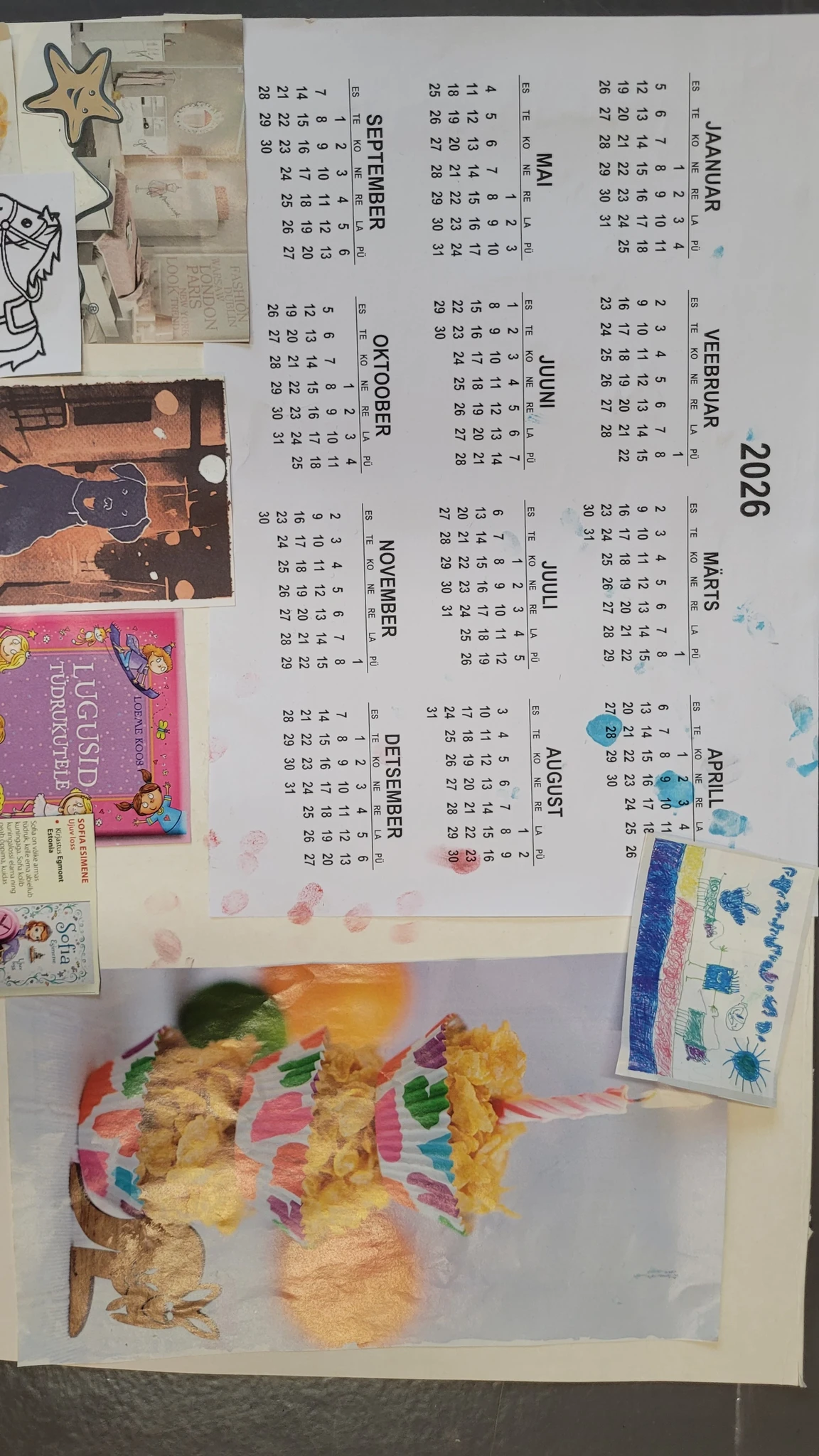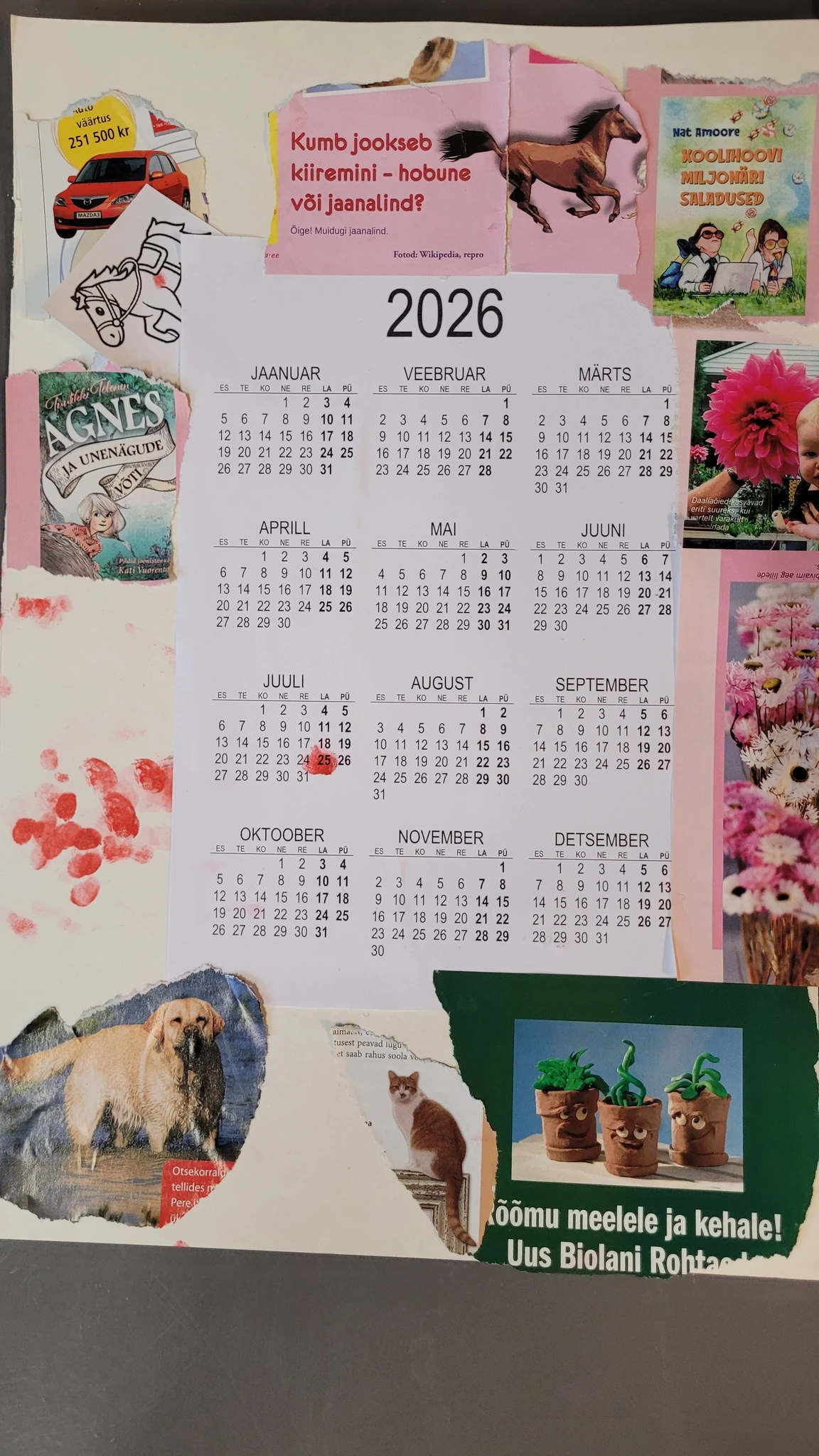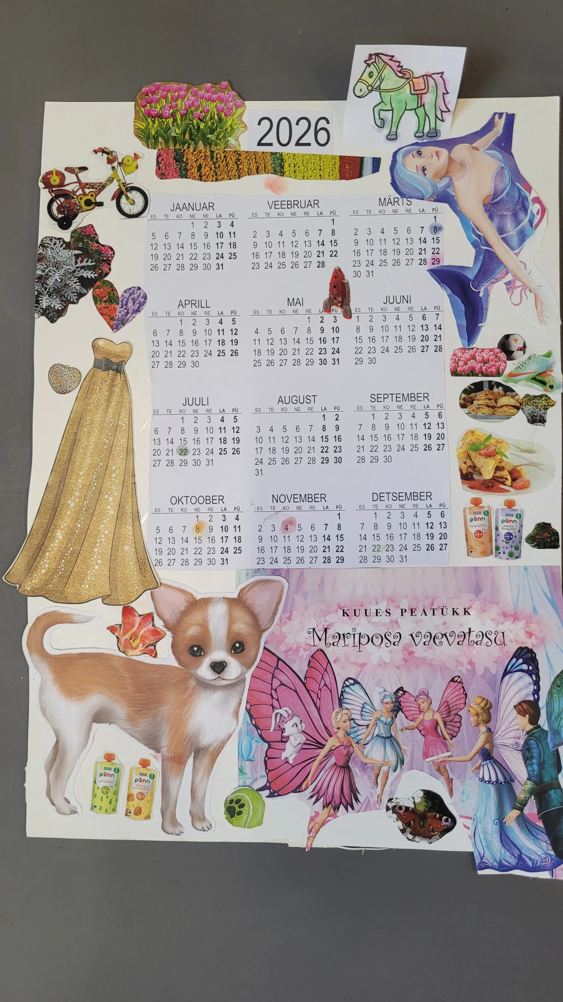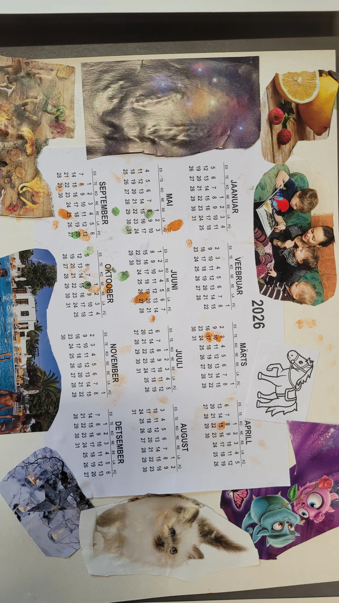 Asetasime meisterdamise pinnale suure kuhja vanasid ajakirju ja asusime koos pilte otsima, mis meile meeldivad ning mis aitaks visualiseerida meie uue aasta soove. Rebisime ja lõikasime. Lehitsesime ja lappasime. Lõpuks oli meil olemas pundar unistusi ja soove. Võtsime suure A3 paberi ja liimisime sinna peale kõigepealt kõik 2026 aasta kalendrikuud, siis liimisime vabaks jäänud kohtadele oma väljaotsitud pildid. Beebid kasutasid liimimiseks ohtralt kliistrit ja kaunistamiseks värvi, mida ajasid laiali käte, jalgade, rullide, pintslite ja svammidega.