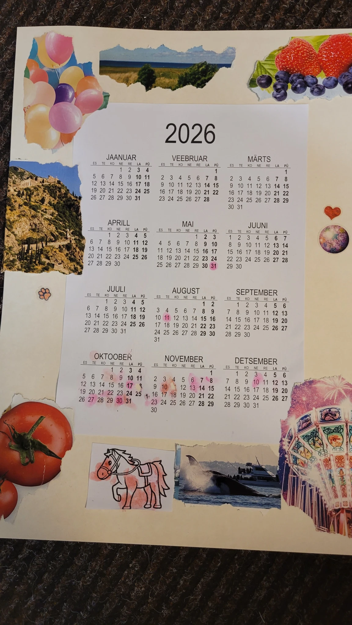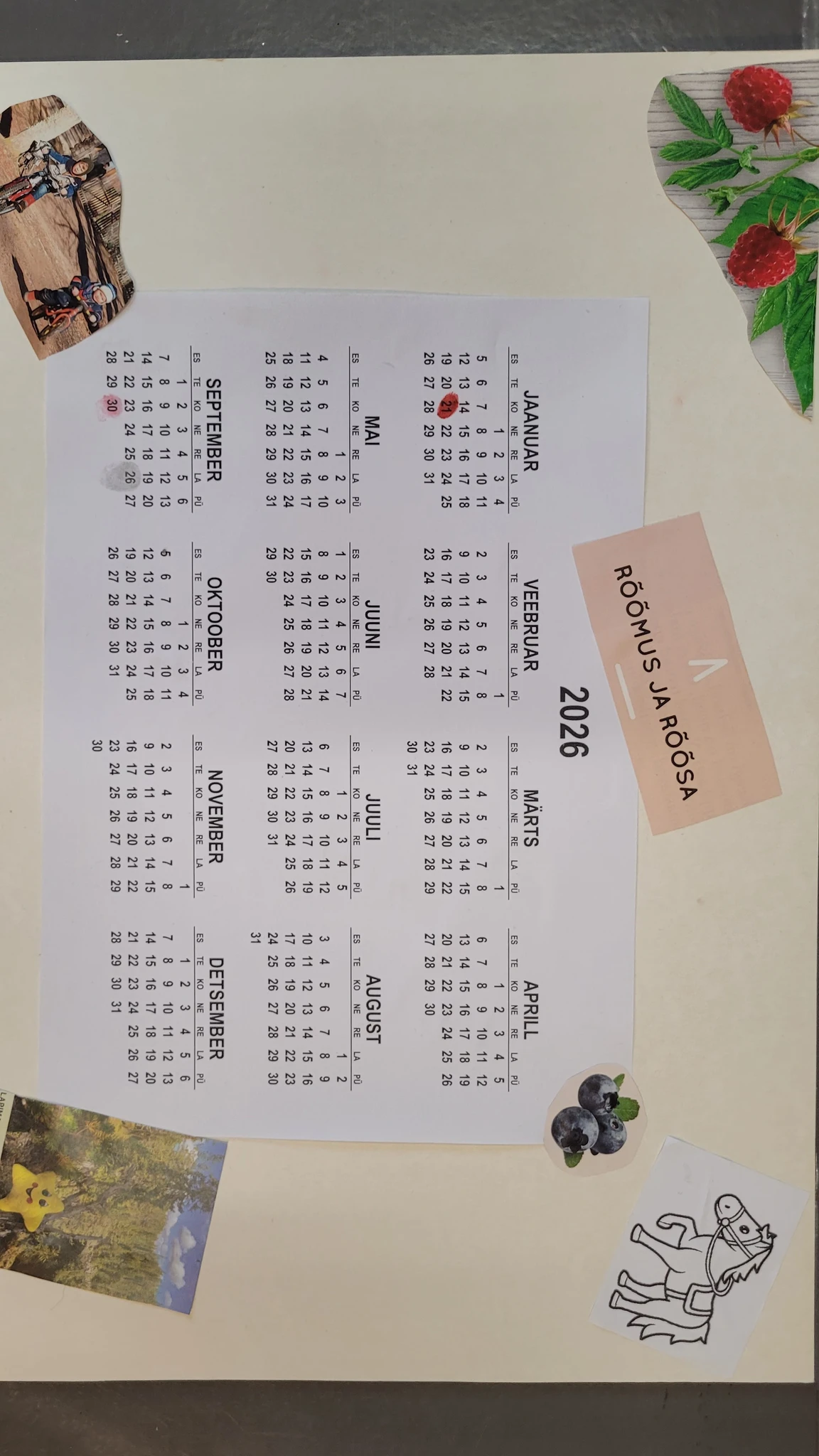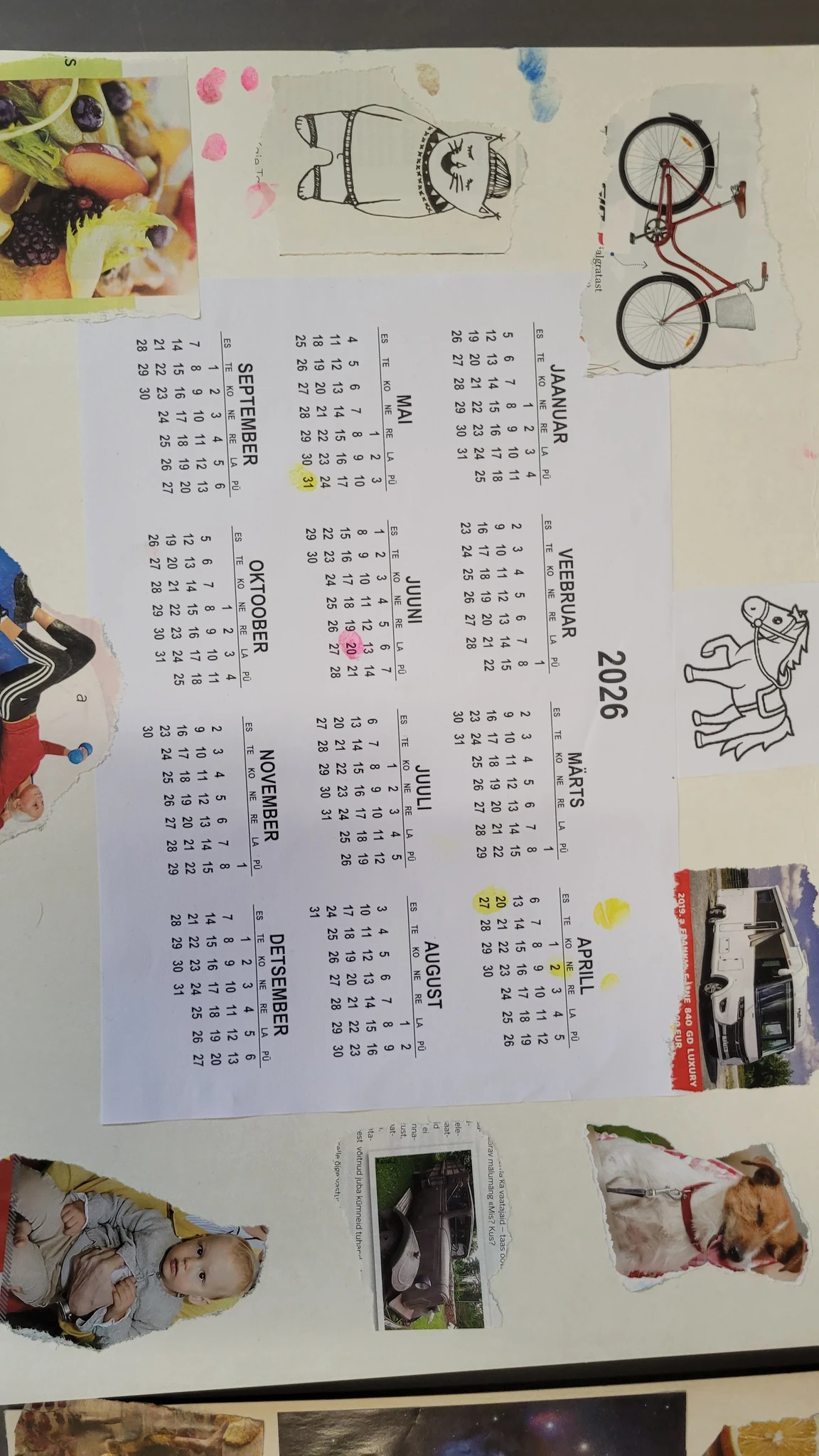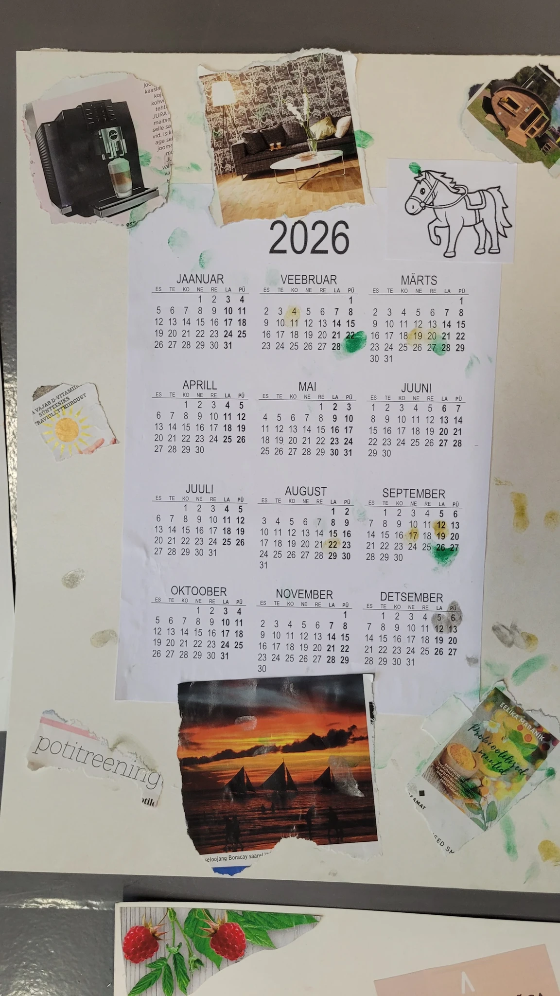 Asetasime meisterdamise pinnale suure kuhja vanasid ajakirju ja asusime koos pilte otsima, mis meile meeldivad ning mis aitaks visualiseerida meie uue aasta soove. Rebisime ja lõikasime. Lehitsesime ja lappasime. Lõpuks oli meil olemas pundar unistusi ja soove. Võtsime suure A3 paberi ja liimisime sinna peale kõigepealt kõik 2026 aasta kalendrikuud, siis liimisime vabaks jäänud kohtadele oma väljaotsitud pildid. Beebid kasutasid liimimiseks ohtralt kliistrit ja kaunistamiseks värvi, mida ajasid laiali käte, jalgade, rullide, pintslite ja svammidega.