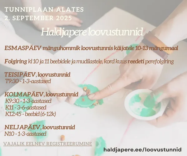 Avame grupi, kui rühma on registreerunu min 6 last. Soovitud loovustunni gruppi registreerumine käib terveks hooajaks, igasse tundi eraldi registreeruma ei pea (v.a. astu-läbi-meetodil ja proovitunnis käimine, mis tähendab iga kord eraldi registreerumist ja korrakaupa tasumist)
