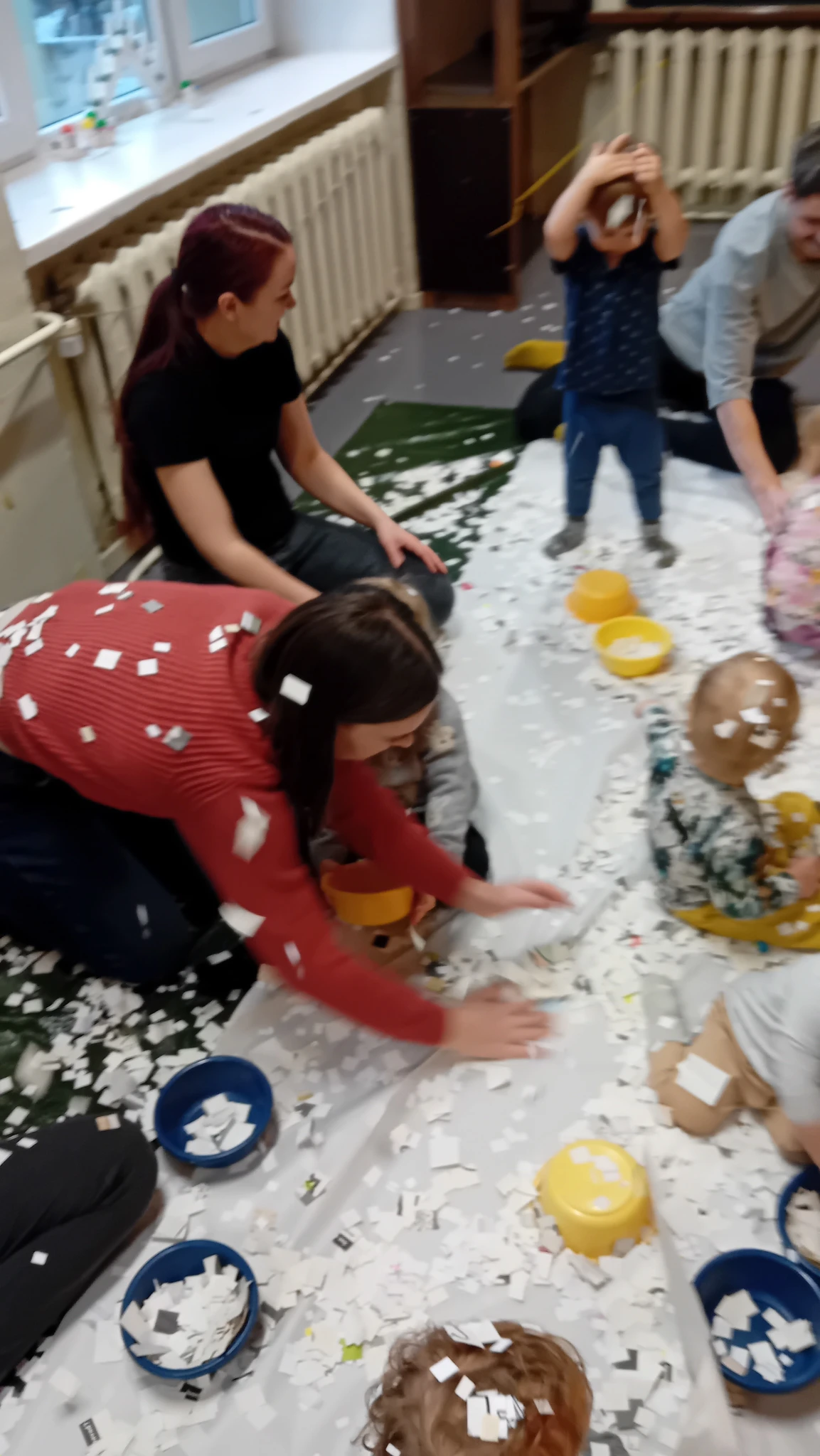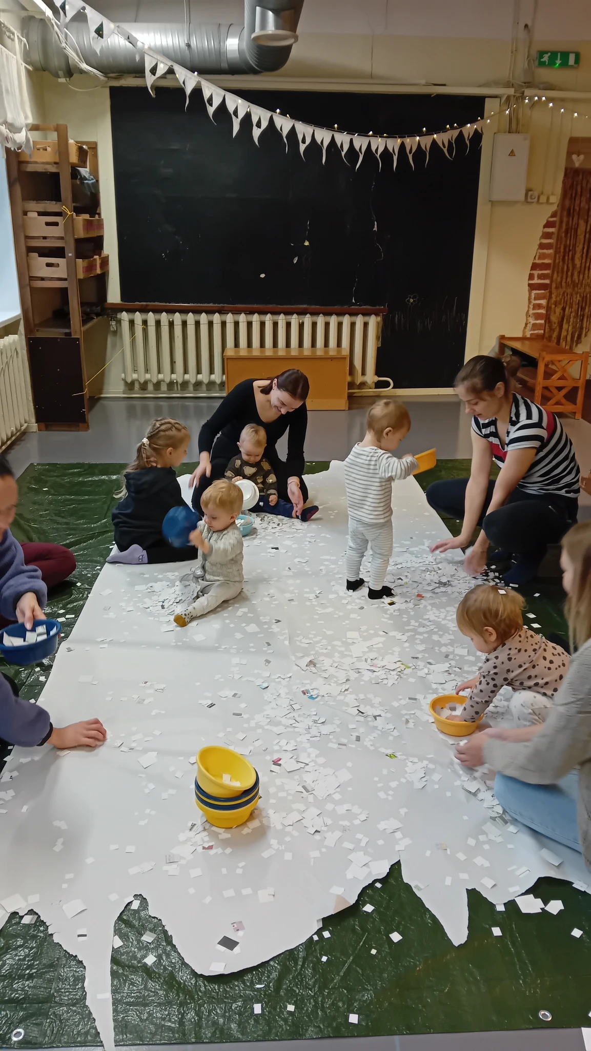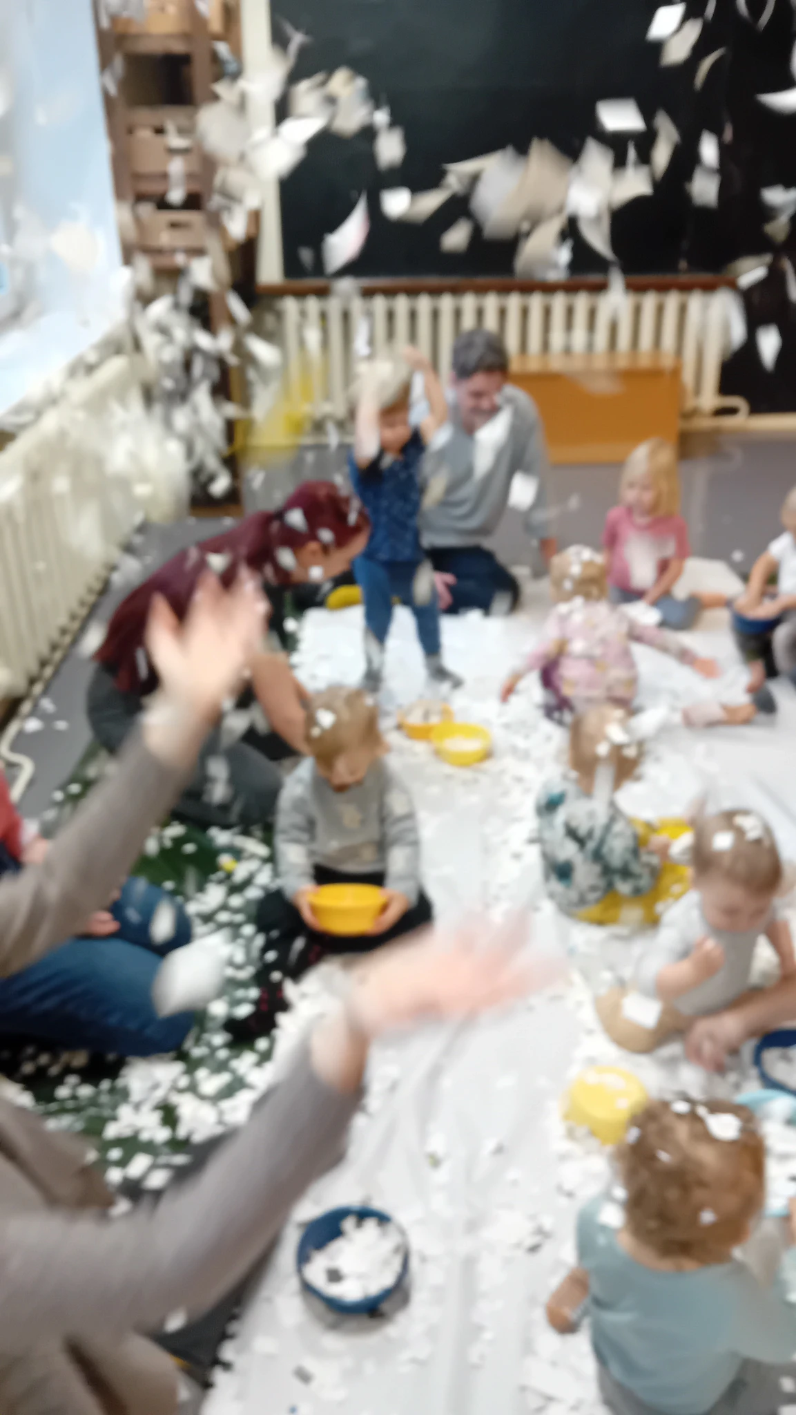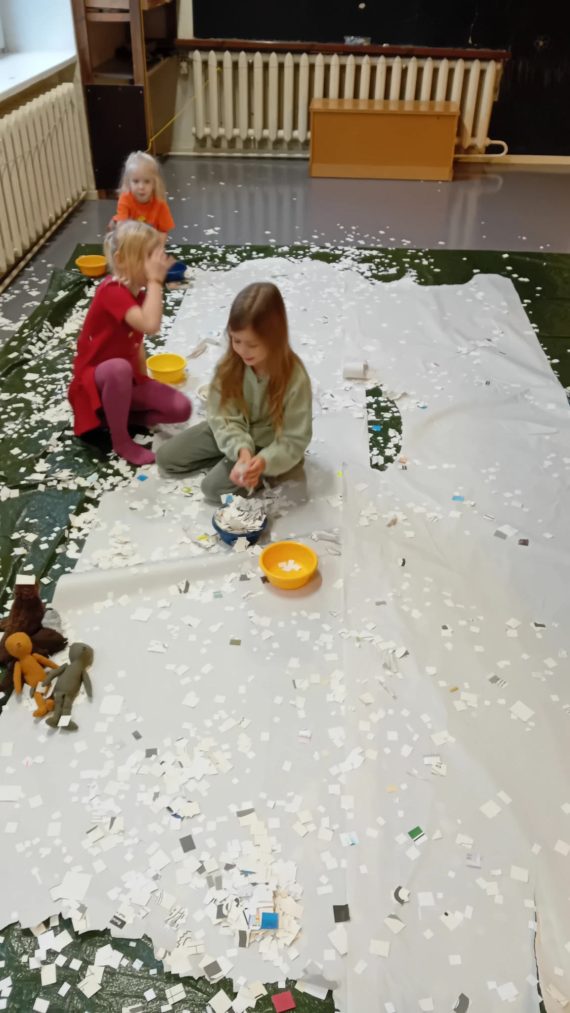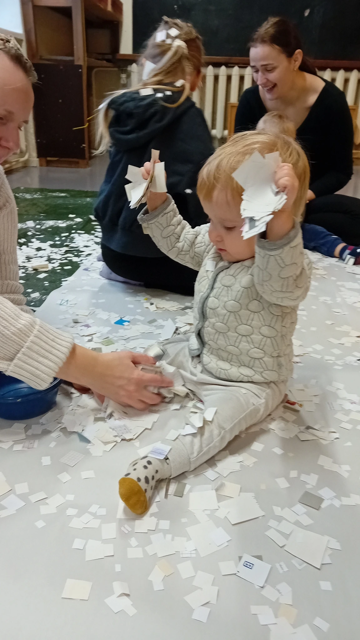 Seejärel korjasime pallid kokku ja lendlema hakkasid... lumehelbed? Ei paberihelbed! Neid sai kokku ajada nagu lund ja loopida ja visata ja lennutada, nii et kogu Haldjapere nägi välja nagu üks keskmist sorti kelgumägi talvisel päeval. Jällegi sai kogu keha mõnusa trenni ja käed ja sõrmed veel eriti.