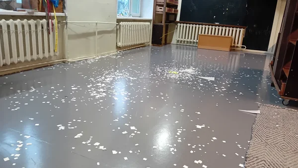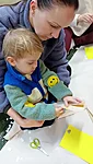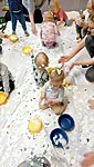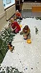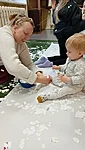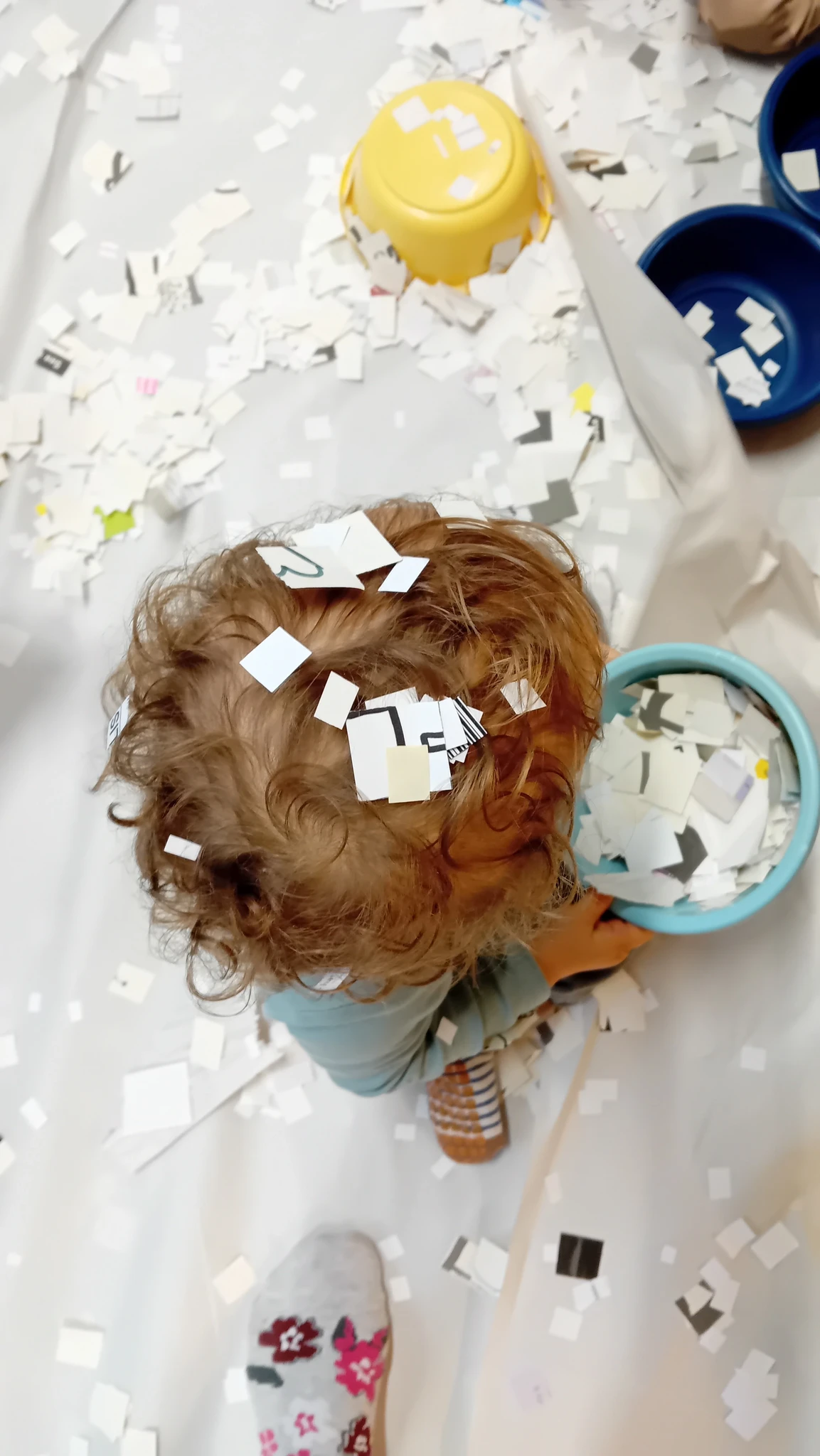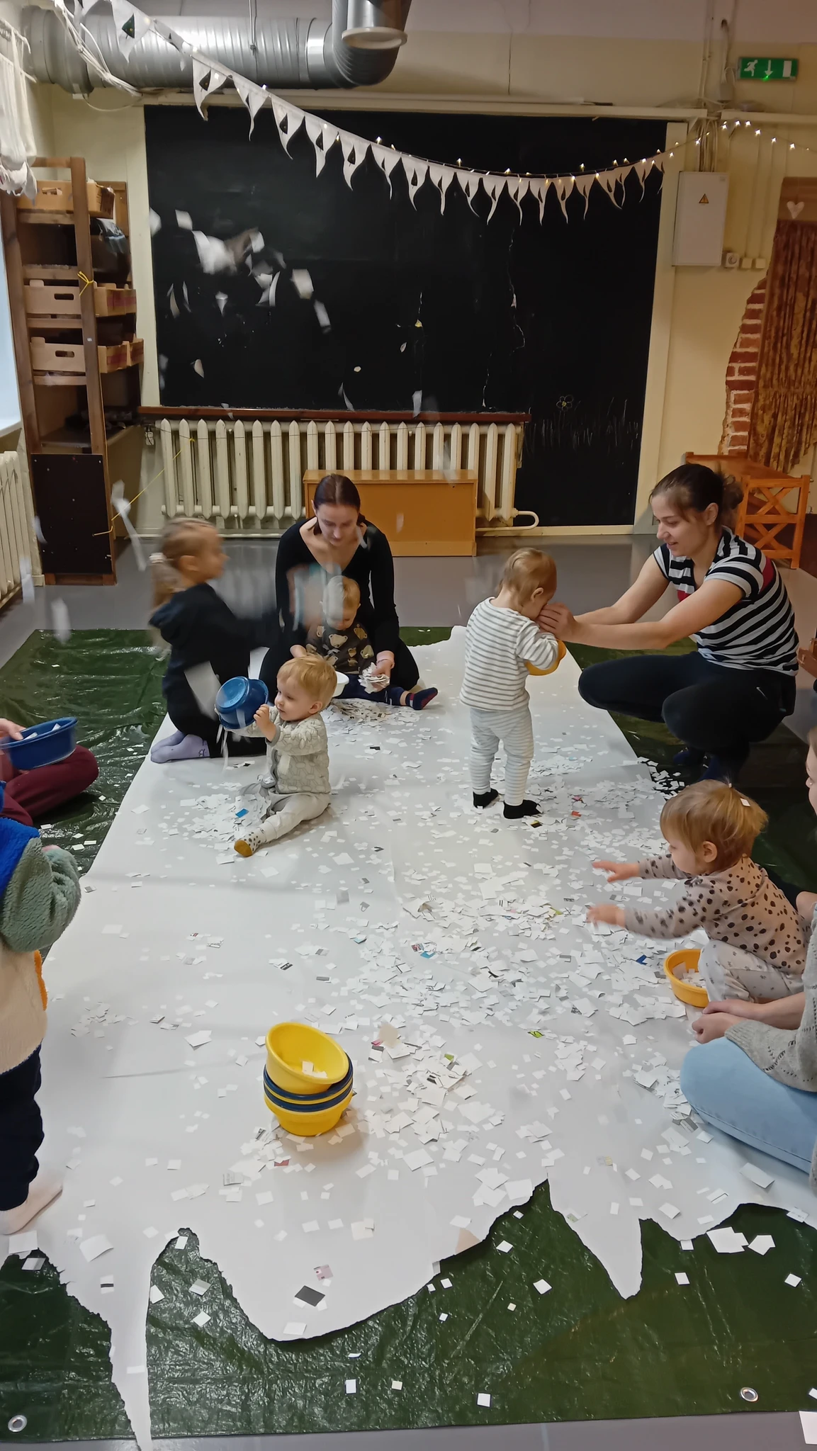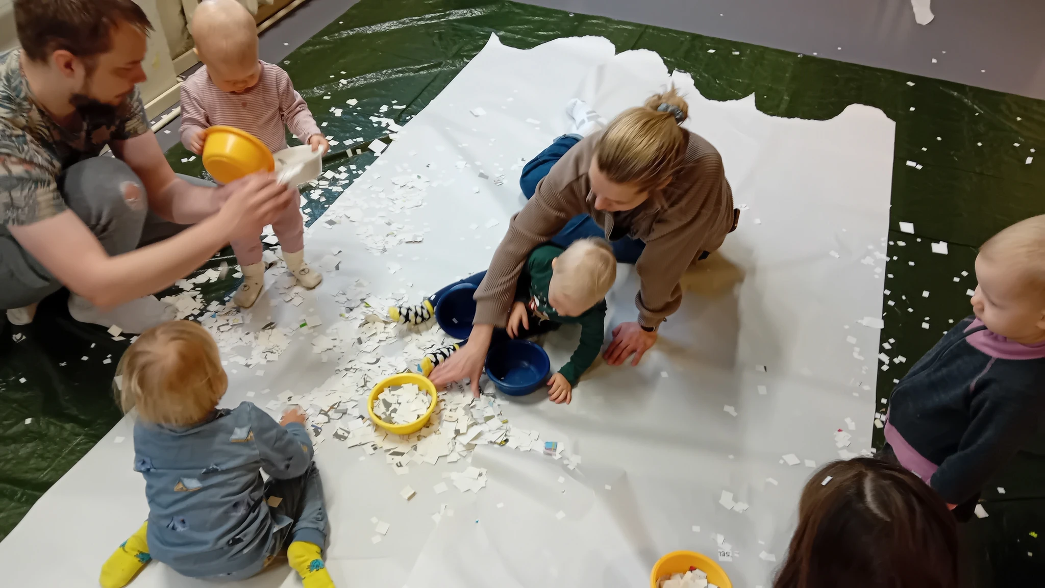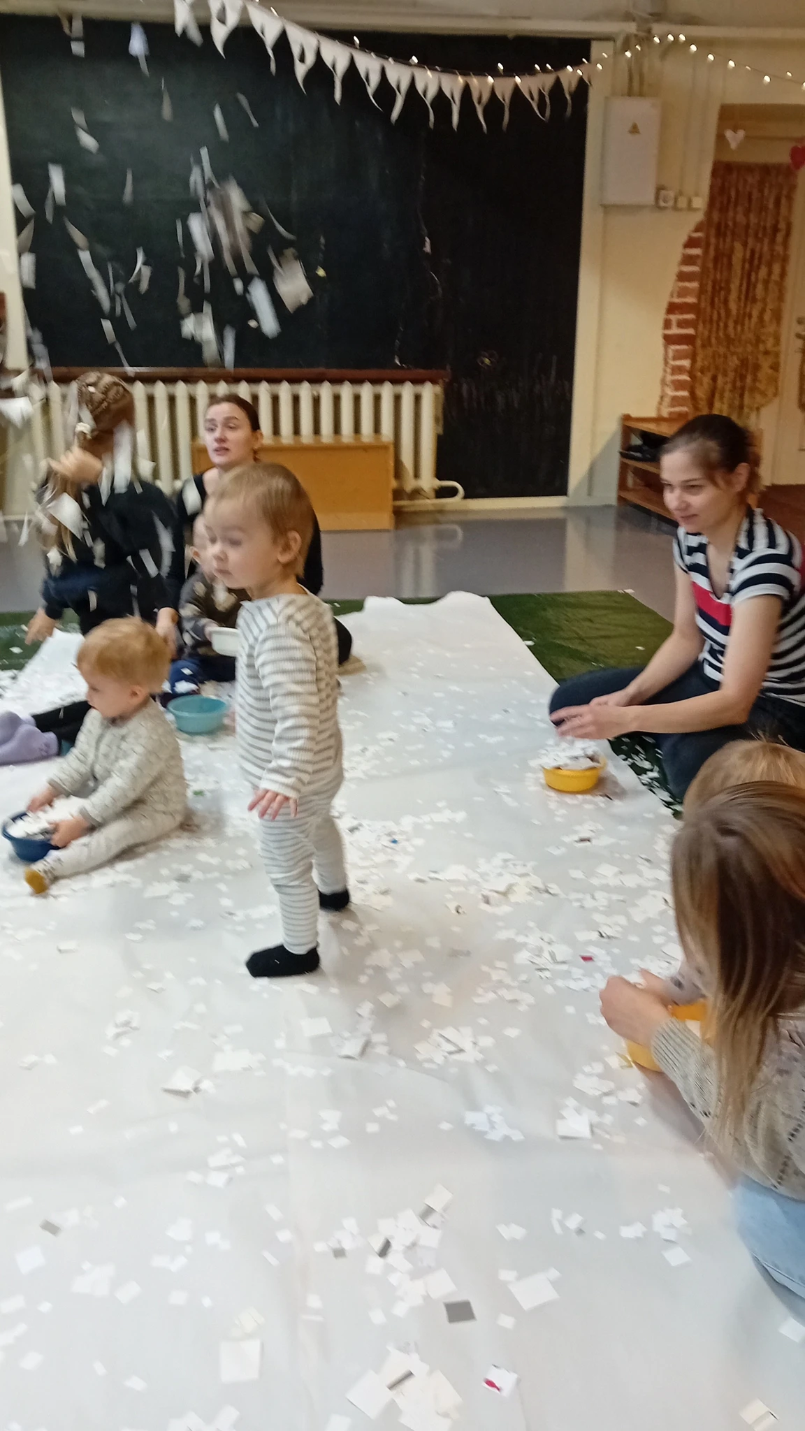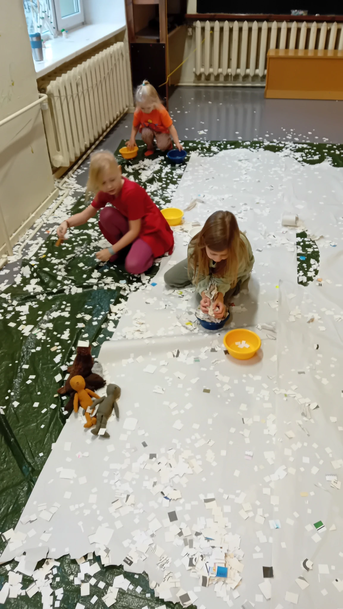 Seejärel korjasime pallid kokku ja lendlema hakkasid... lumehelbed? Ei paberihelbed! Neid sai kokku ajada nagu lund ja loopida ja visata ja lennutada, nii et kogu Haldjapere nägi välja nagu üks keskmist sorti kelgumägi talvisel päeval. Jällegi sai kogu keha mõnusa trenni ja käed ja sõrmed veel eriti.