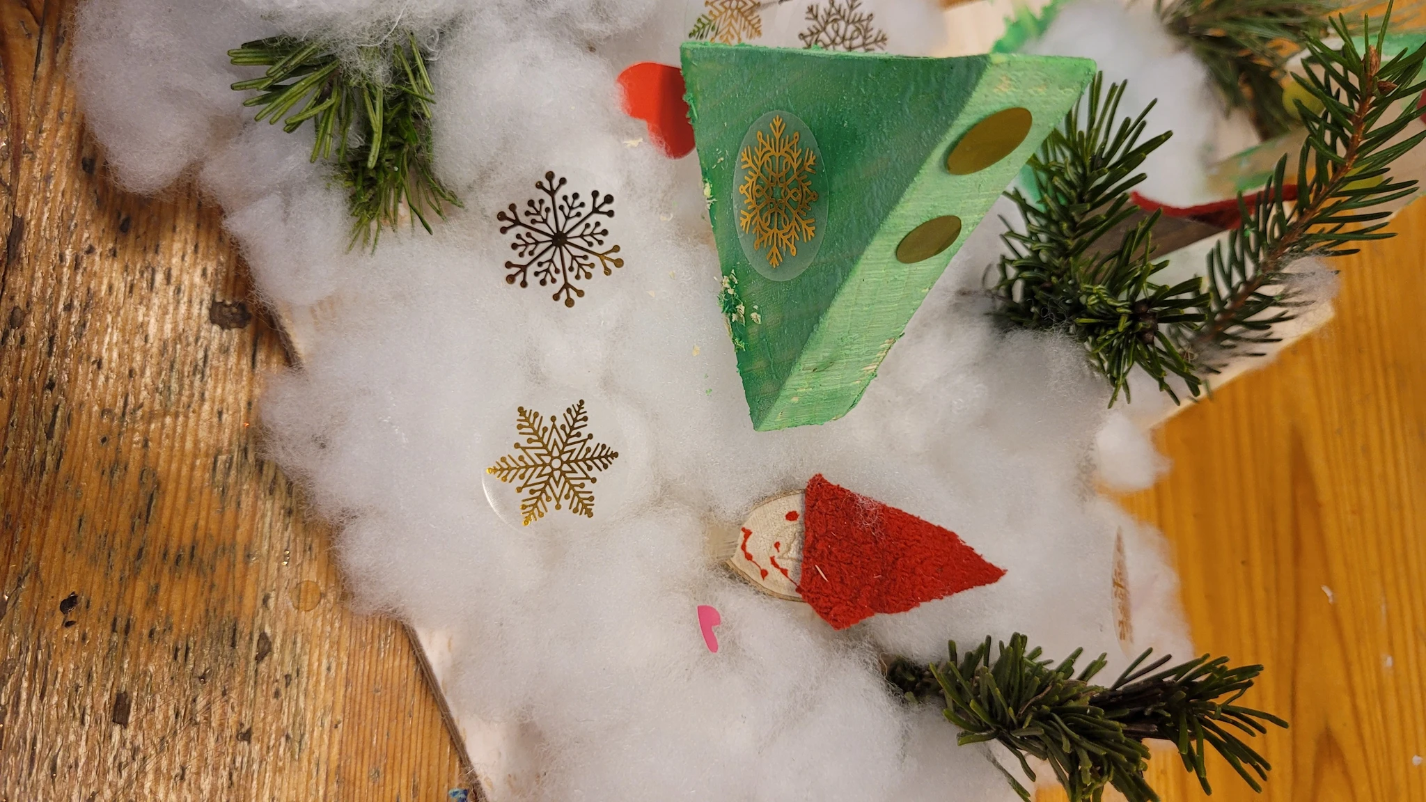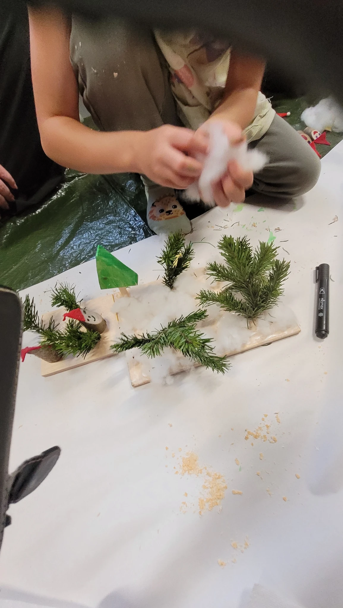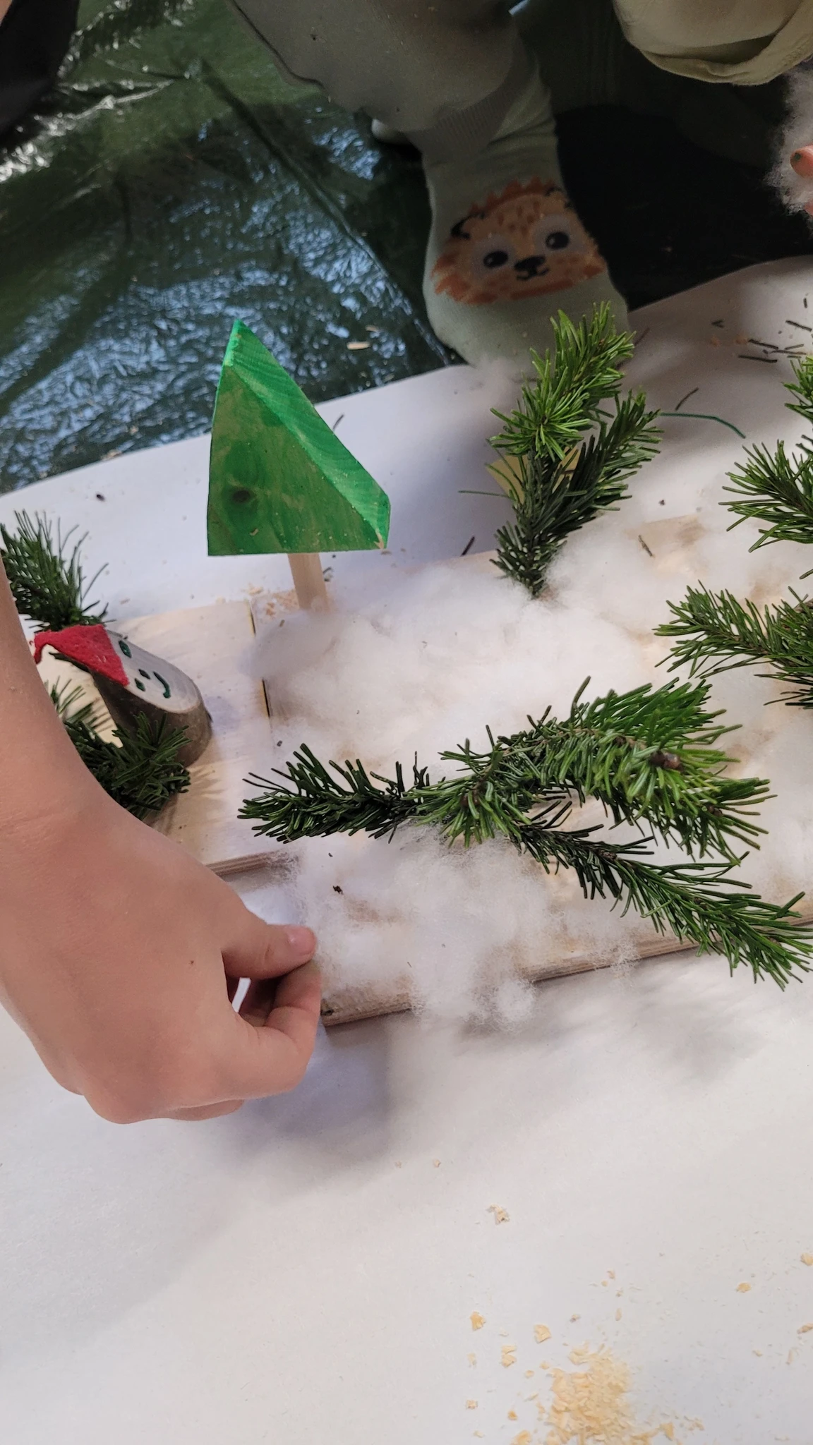 Nüüd asusime meisterdama omaenda päkapikumaad. Selleks oli vaja veidi puutööd teha. Saime väikese vineerplaadi, mille servad tuli lihvida liivapaberiga, siis värvisime selle valgeks ja jätsime kuivama. Nüüd saime 2 kuusekese tükki- kuusk ja kuuse jalg. Kuuse värvisime roheliseks ja jätsime taas kuivama. Nüüd valmis oksast päkapikk, kellele oli veel vaja mütsi ja silmi ja oligi naksti valmis. Puurisime seejärel kuusekese sisse augu, et see ühendada kuusejalaga ja ka alusesse 1 auk, et see sinna istutada. Nüüd oli võimalik alusele ka vatti ehk lund lisada ning kuuseke ära ehtida erinevate sädelevate kleepsutäppidega. Päkapikud said nunnud ja olid oma kuusekese ja lumemaaga väga uhked.