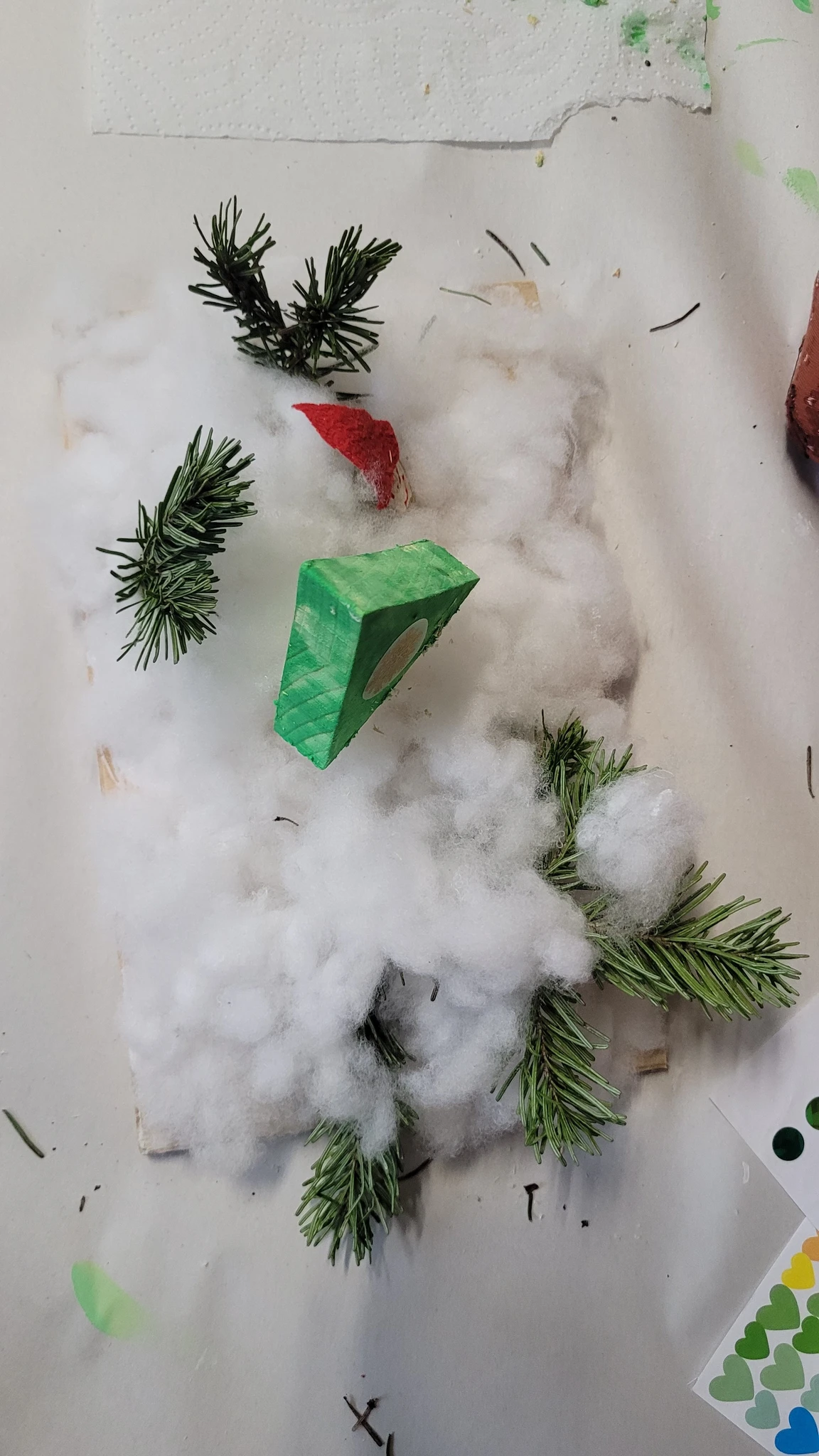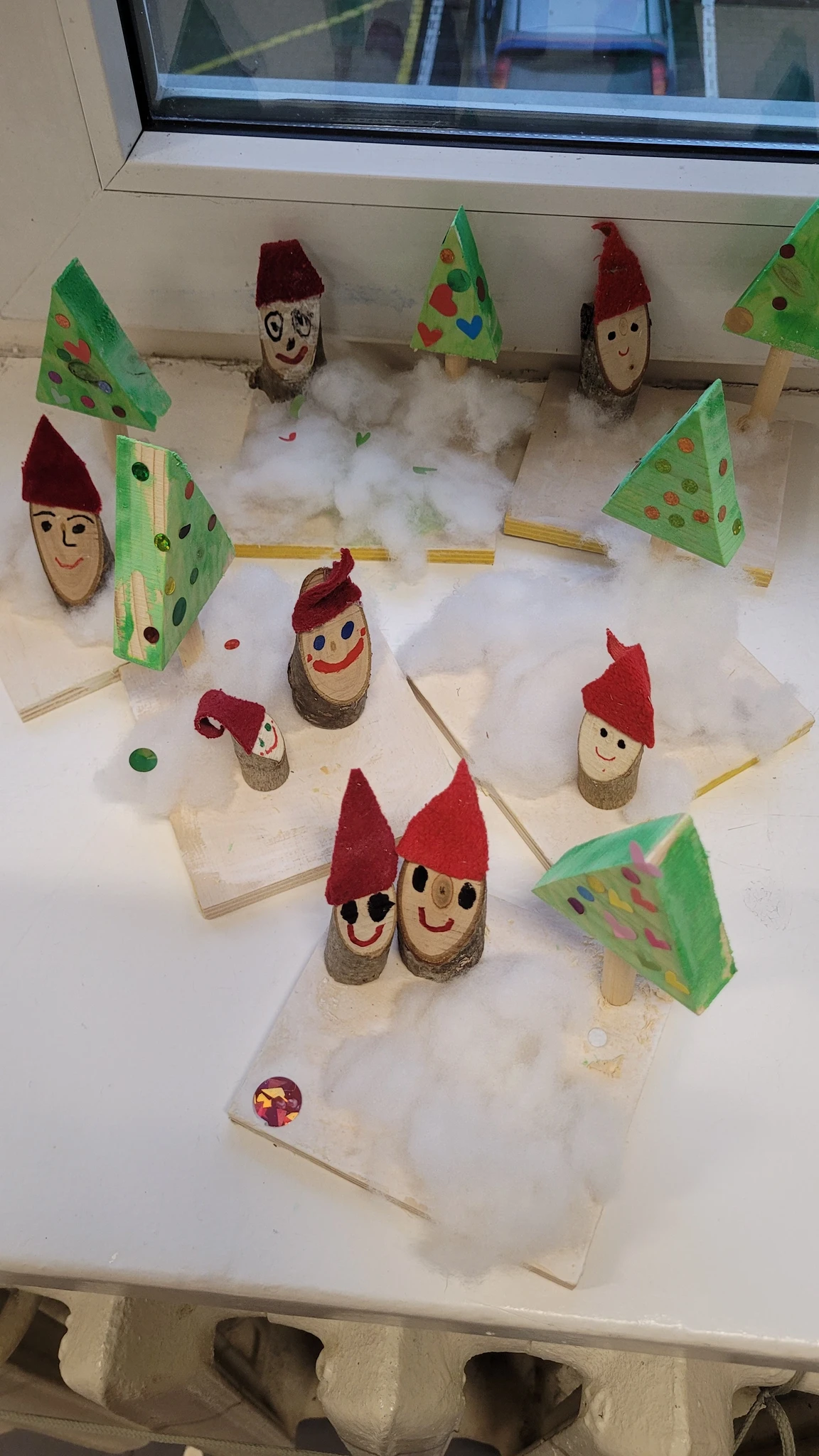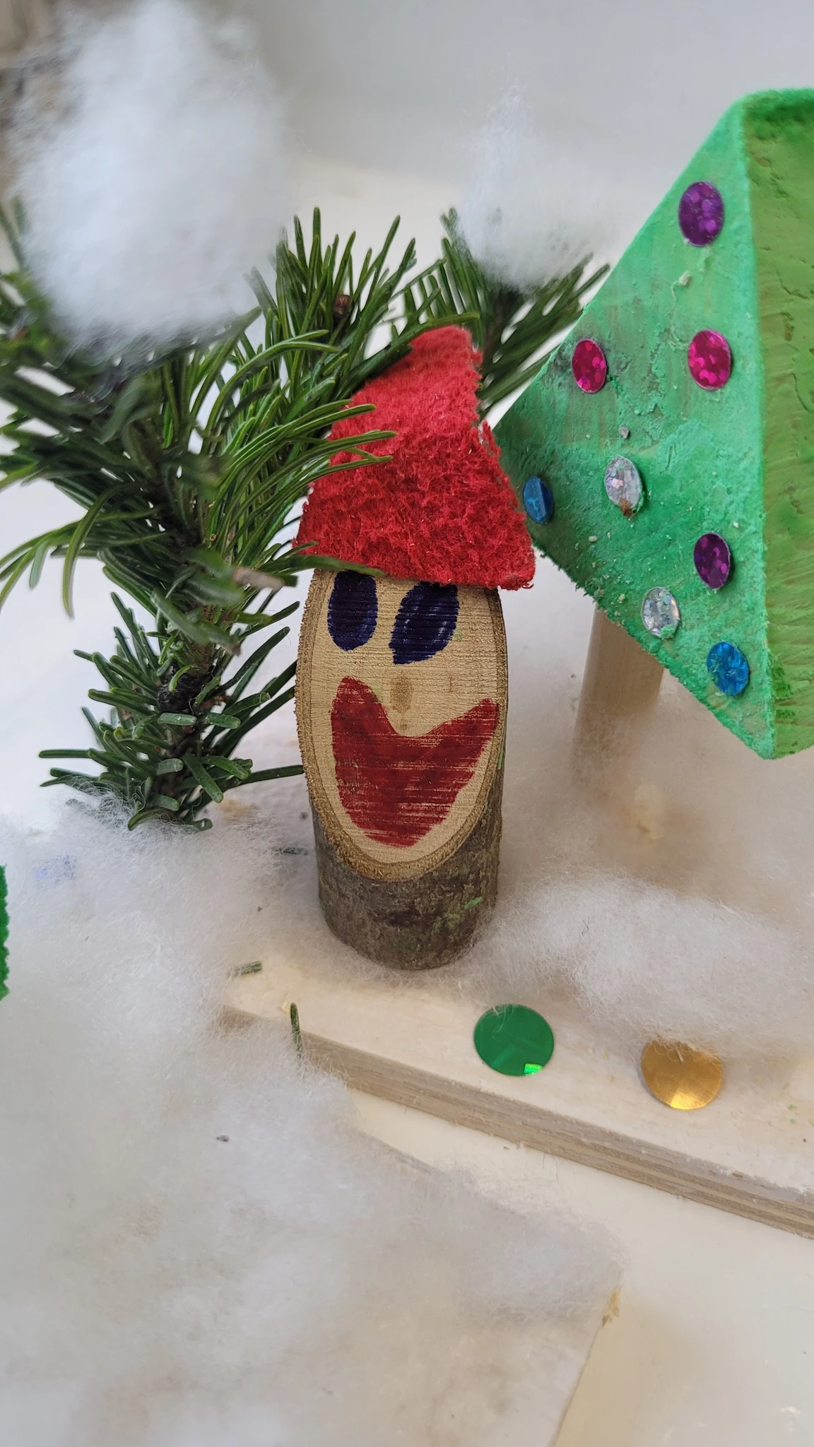 Nüüd asusime meisterdama omaenda päkapikumaad. Selleks oli vaja veidi puutööd teha. Saime väikese vineerplaadi, mille servad tuli lihvida liivapaberiga, siis värvisime selle valgeks ja jätsime kuivama. Nüüd saime 2 kuusekese tükki- kuusk ja kuuse jalg. Kuuse värvisime roheliseks ja jätsime taas kuivama. Nüüd valmis oksast päkapikk, kellele oli veel vaja mütsi ja silmi ja oligi naksti valmis. Puurisime seejärel kuusekese sisse augu, et see ühendada kuusejalaga ja ka alusesse 1 auk, et see sinna istutada. Nüüd oli võimalik alusele ka vatti ehk lund lisada ning kuuseke ära ehtida erinevate sädelevate kleepsutäppidega. Päkapikud said nunnud ja olid oma kuusekese ja lumemaaga väga uhked.