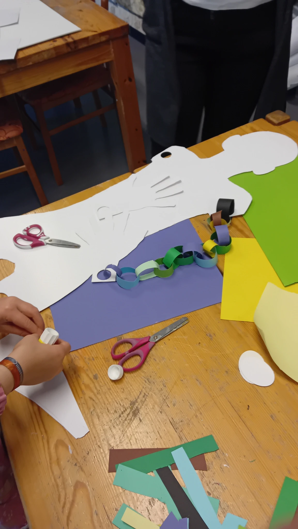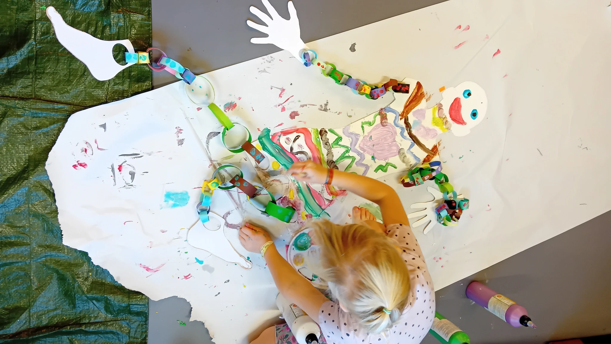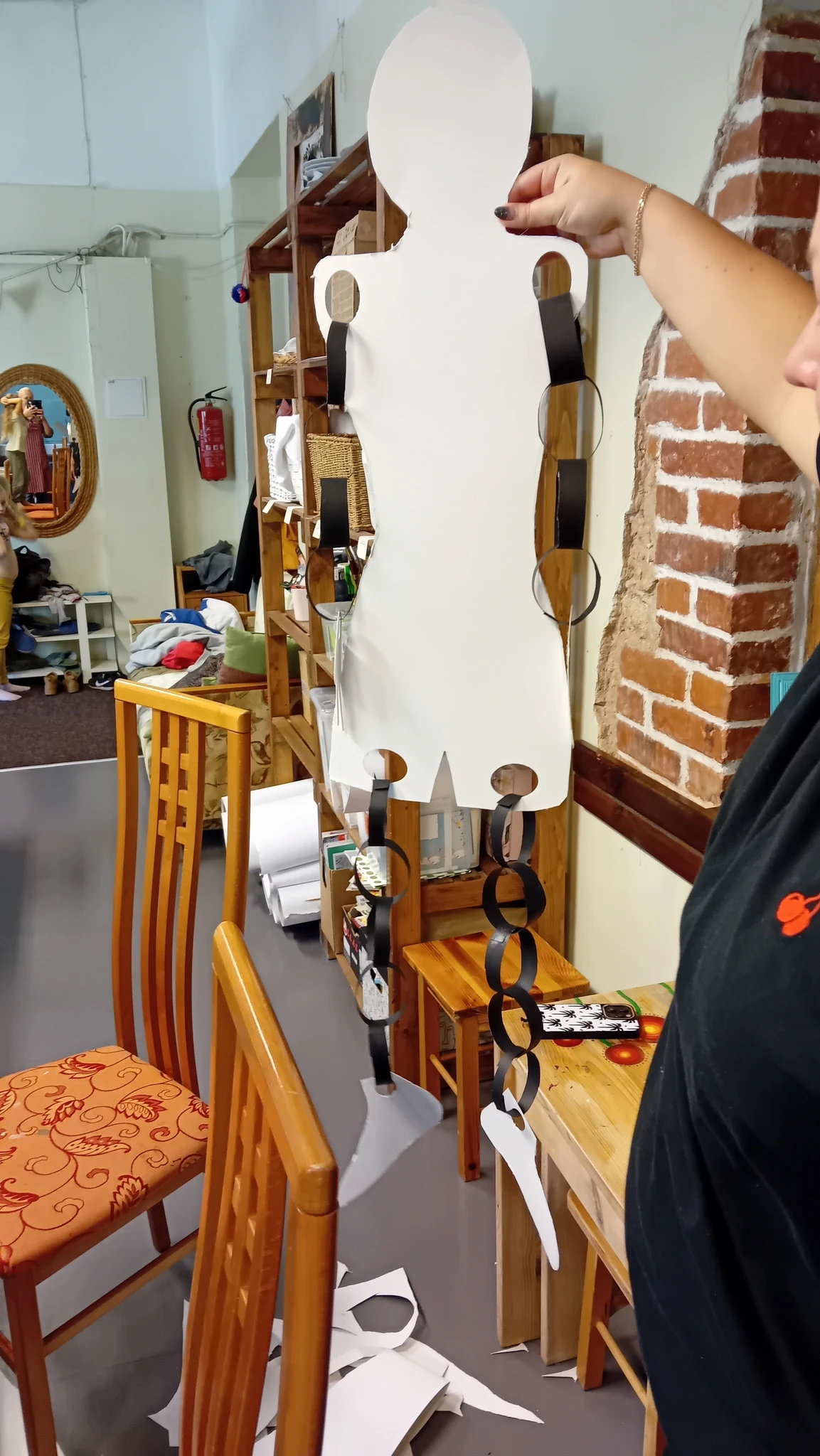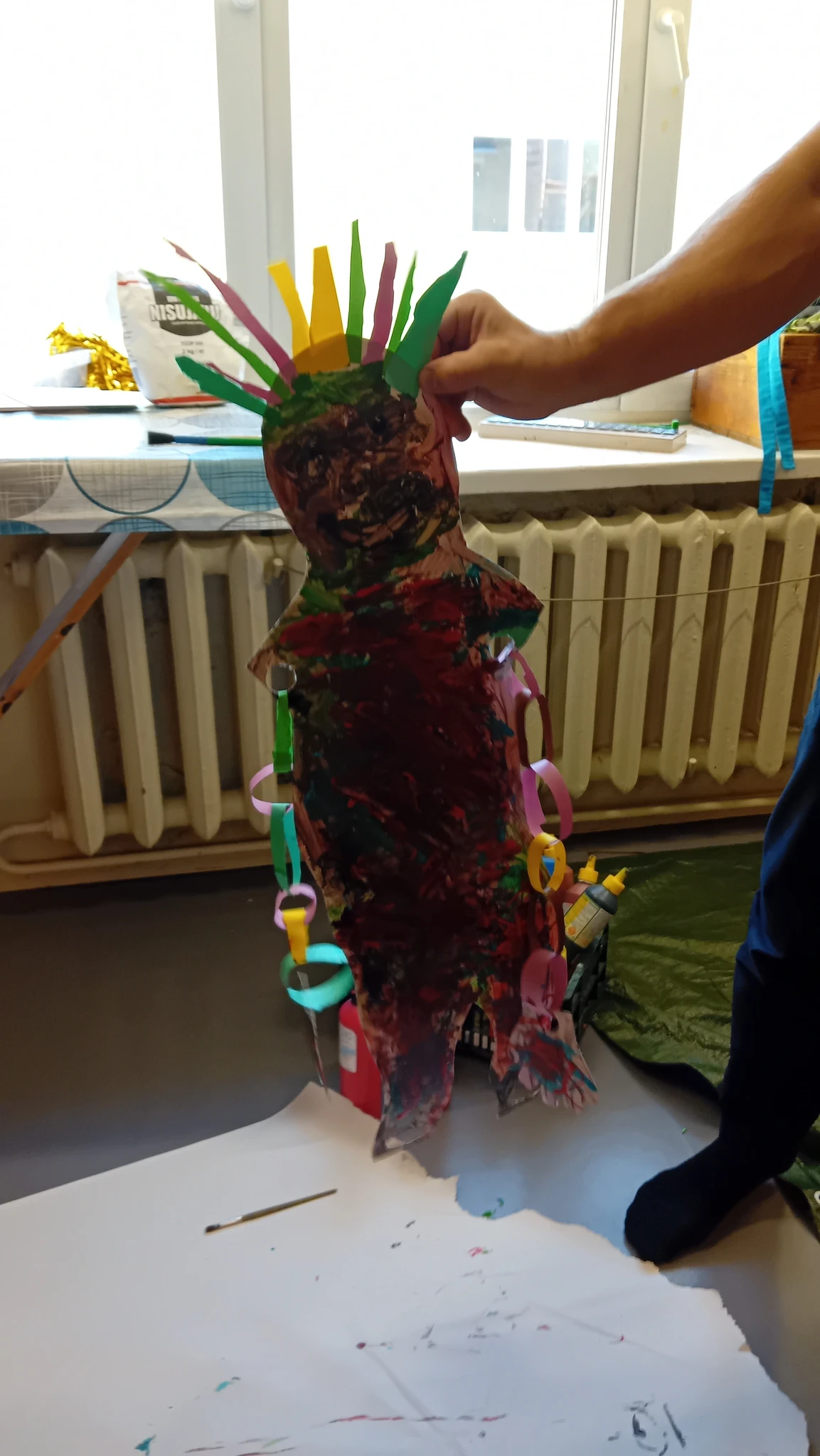 Suuremad lapsed meisterdasid ühe vahva tuulekolli. Ikka kõigepealt ise papile pikali ja saatja joonistas piirjooned maha. Seejärel sai keha välja lõigata ja sellele paberiribadest igavesti vahvad lehvivad käed ja jalad meisterdada. Ja kõige lõpuks sai oma uue sõbra ka ära disainida.