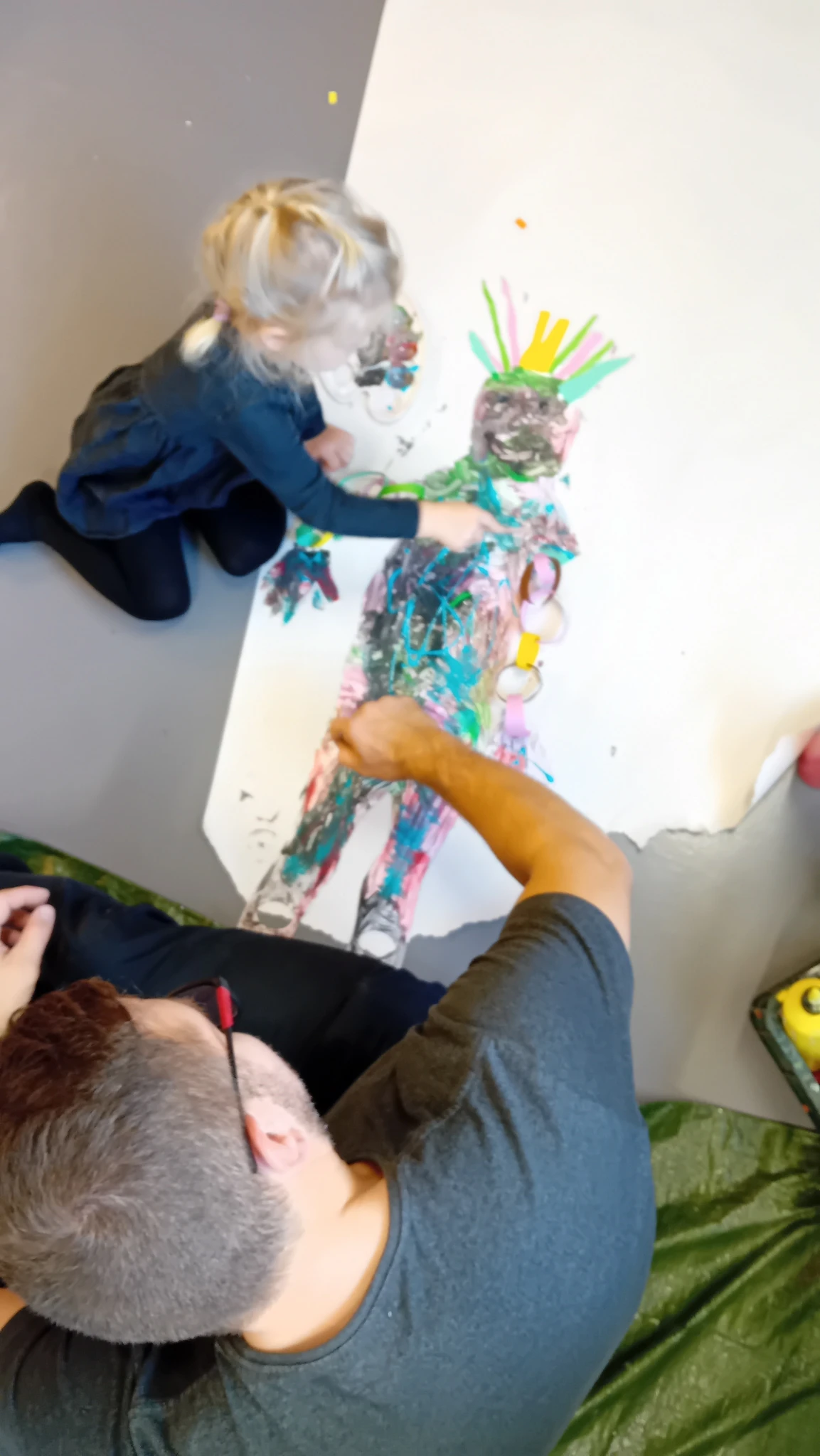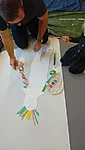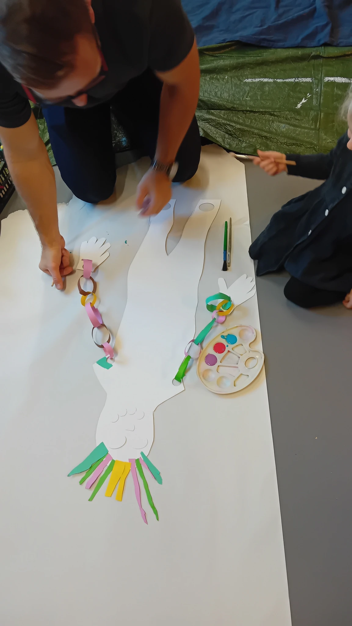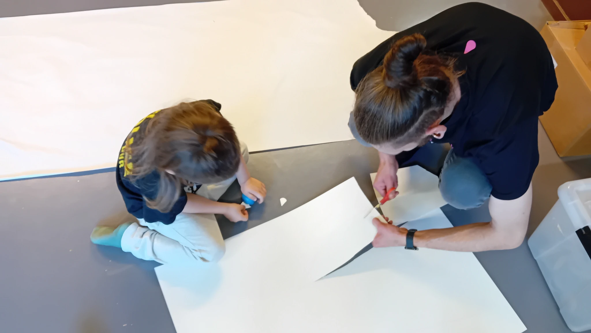 Suuremad lapsed meisterdasid ühe vahva tuulekolli. Ikka kõigepealt ise papile pikali ja saatja joonistas piirjooned maha. Seejärel sai keha välja lõigata ja sellele paberiribadest igavesti vahvad lehvivad käed ja jalad meisterdada. Ja kõige lõpuks sai oma uue sõbra ka ära disainida.